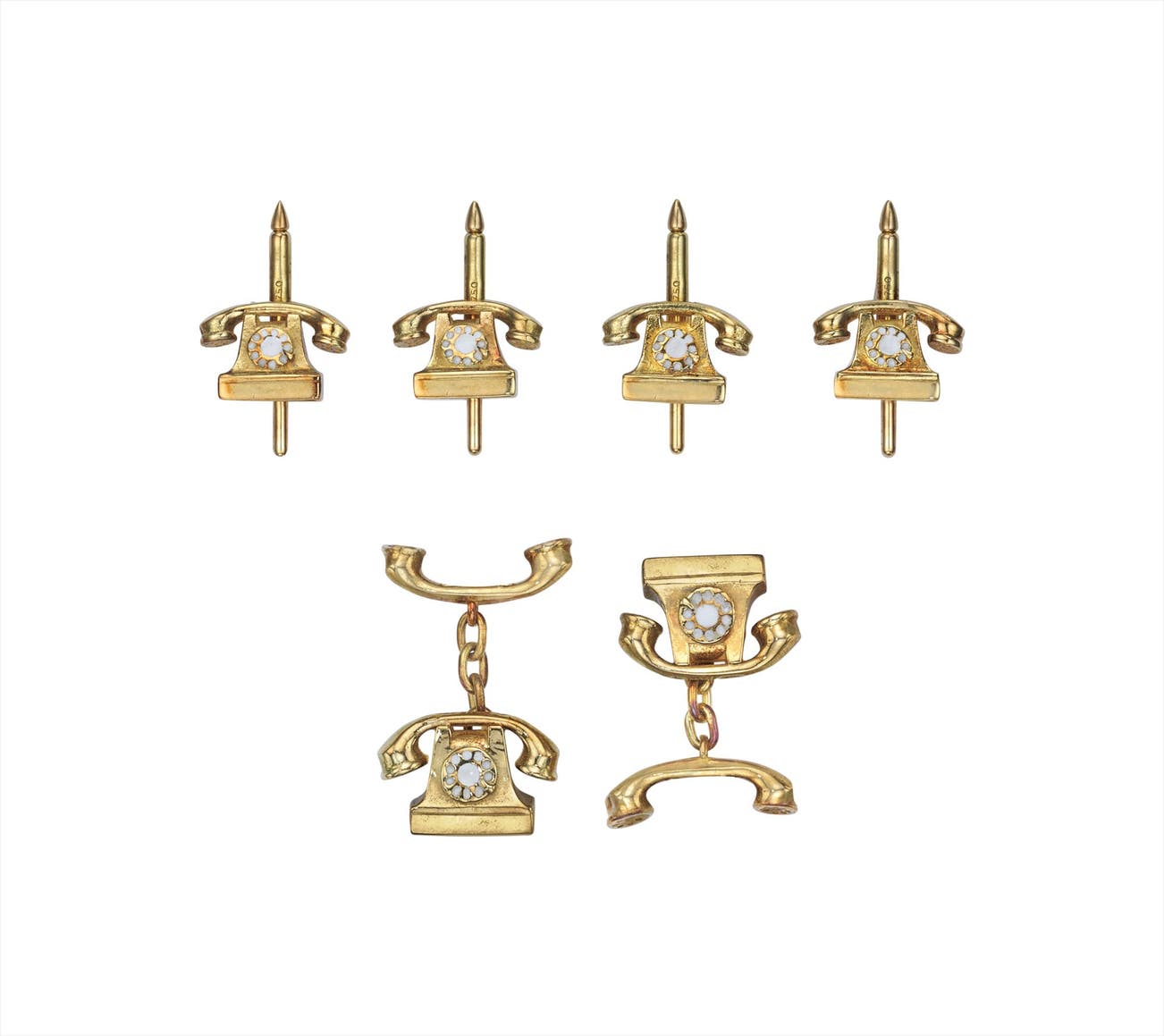Comprising a pair of cufflinks, each designed as a polished gold telephone and telephone handle; and four similarly designed shirt studs en suite, mounted in 18K yellow gold, cufflink length 1 1/4 inch, shirt stud length 1 inch.