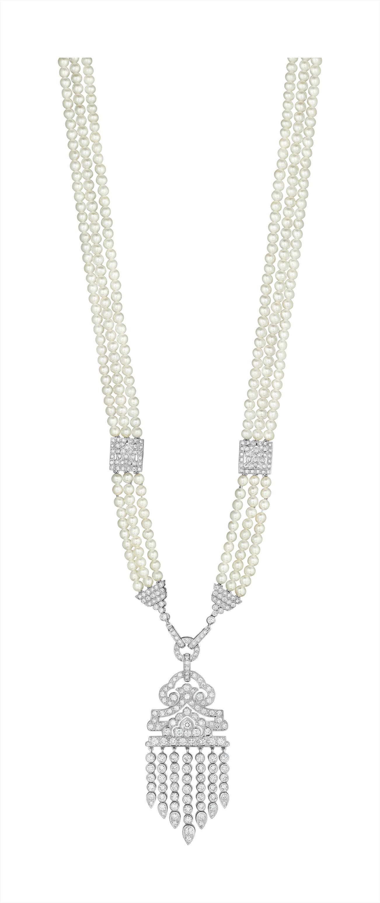Designed as a three-strand cultured pearl longchain, enhanced by pavé-set diamond links, to the scrolling geometric diamond pendant entirely set with circular-cut diamonds, suspending diamond tassels, mounted in 18K white gold, length 31 inches.