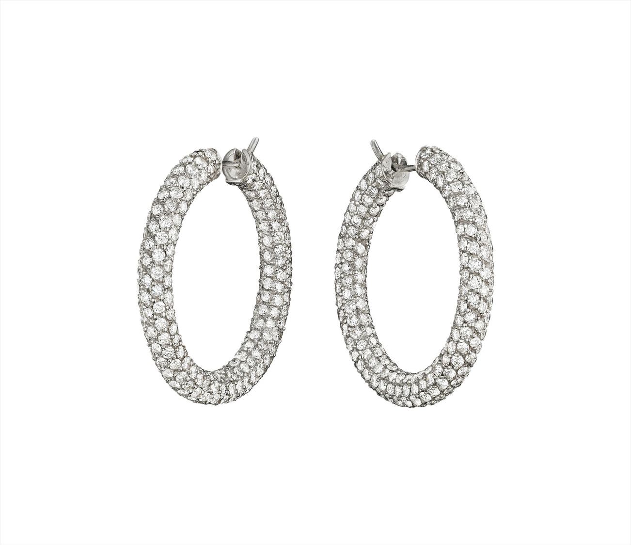 Each designed as a pavé-set diamond hoop, mounted in 18K white gold, length 1 1/3 inches.