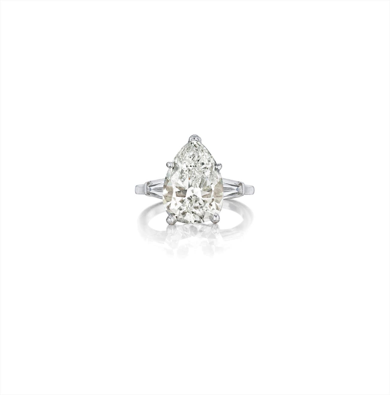 Set with a pear-shaped diamond, weighing approximately 3.47 carats, framed on either side by step-cut diamond shoulders, mounted in platinum, size 4 1/4.