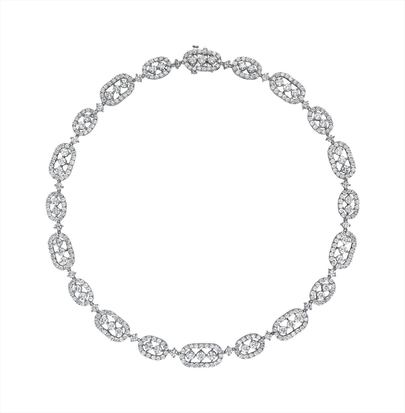 Designed as a series of circular-cut diamond open-work geometric links, interspersed with circular-cut diamond spacers, mounted in 18K white gold, length 16 inches.
