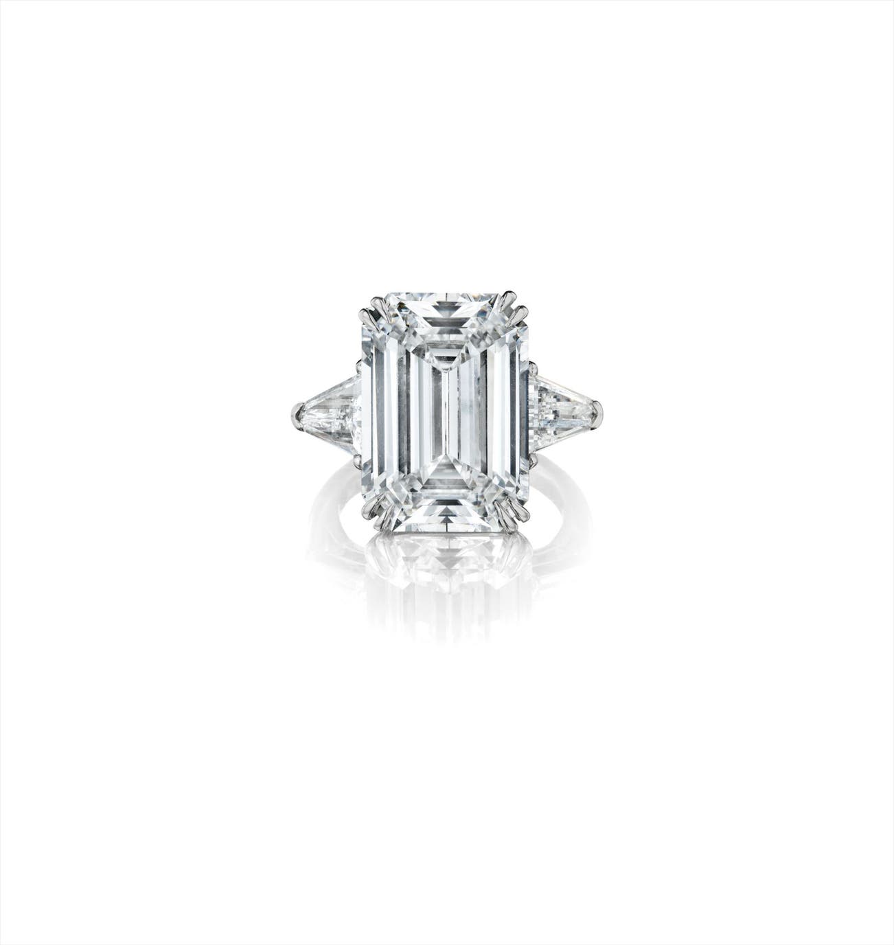 Set with a rectangular-cut diamond, weighing approximately 10.54 carats, flanked by trapezoid-cut diamond shoulders, mounted in platinum, size 5 1/4.