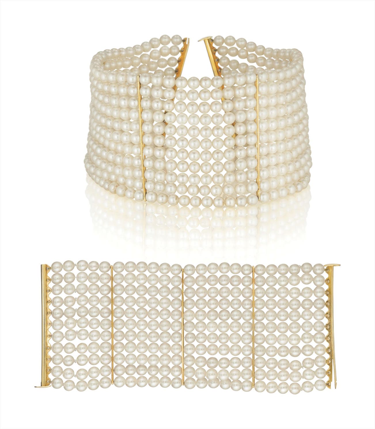 Comprising a choker necklace designed as eleven strands of cultured pearls, measuring approximately 6.50 mm, interspersed by polished gold spacers; a bracelet en suite, mounted in 18K yellow gold, necklace length 13 inches, bracelet length 6 3/4 inches.