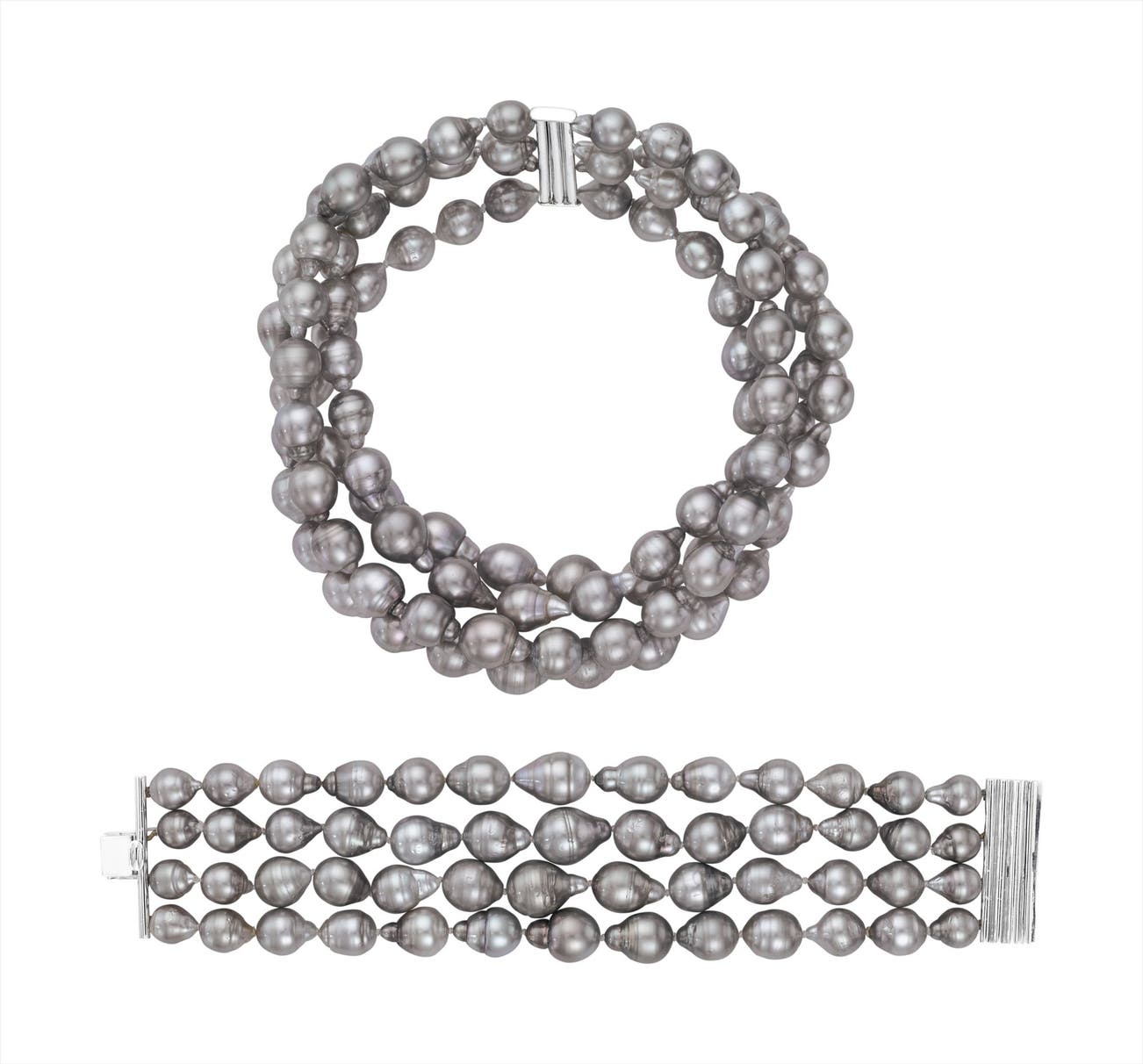 Comprising a choker necklace designed as four strands of silver baroque cultured pearls, measuring from approximately 15.75 to 9.00 mm, joined by a polished gold clasp; a bracelet en suite, mounted in 18K white gold, necklace length 11 3/4 to 12 1/2 inches, bracelet length 7 1/4 inches.