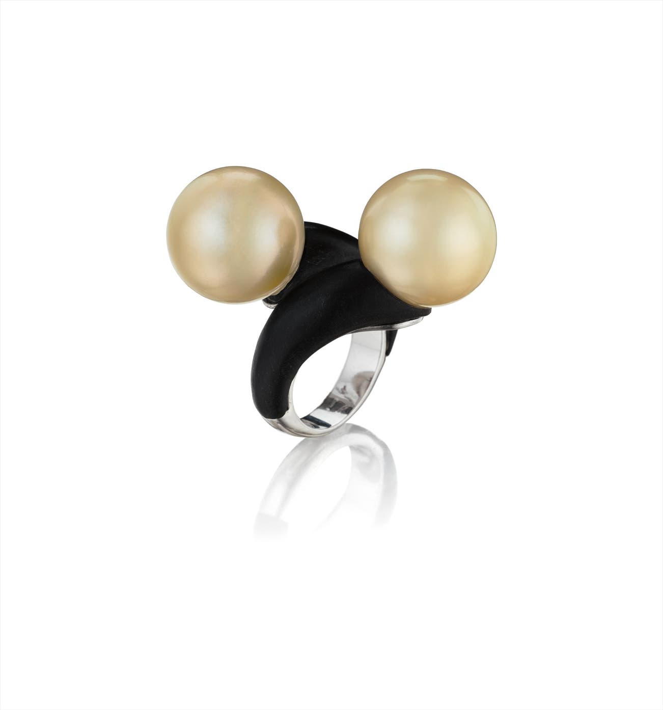 Of crossover design, set with two South Sea cultured pearls to the carved ebony half hoop, mounted in 18K white gold, size 6 3/4.