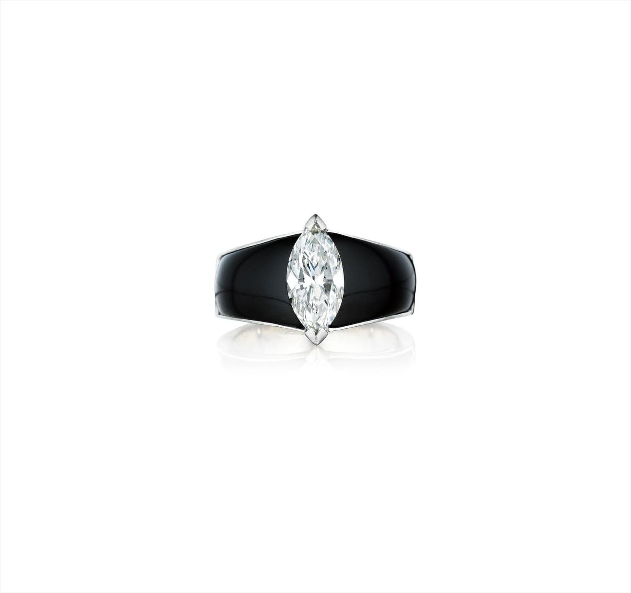 Centrally set with a marquise-cut diamond, flanked by carved onyx shoulders, to the polished hoop, mounted in 18K white gold, size 4.