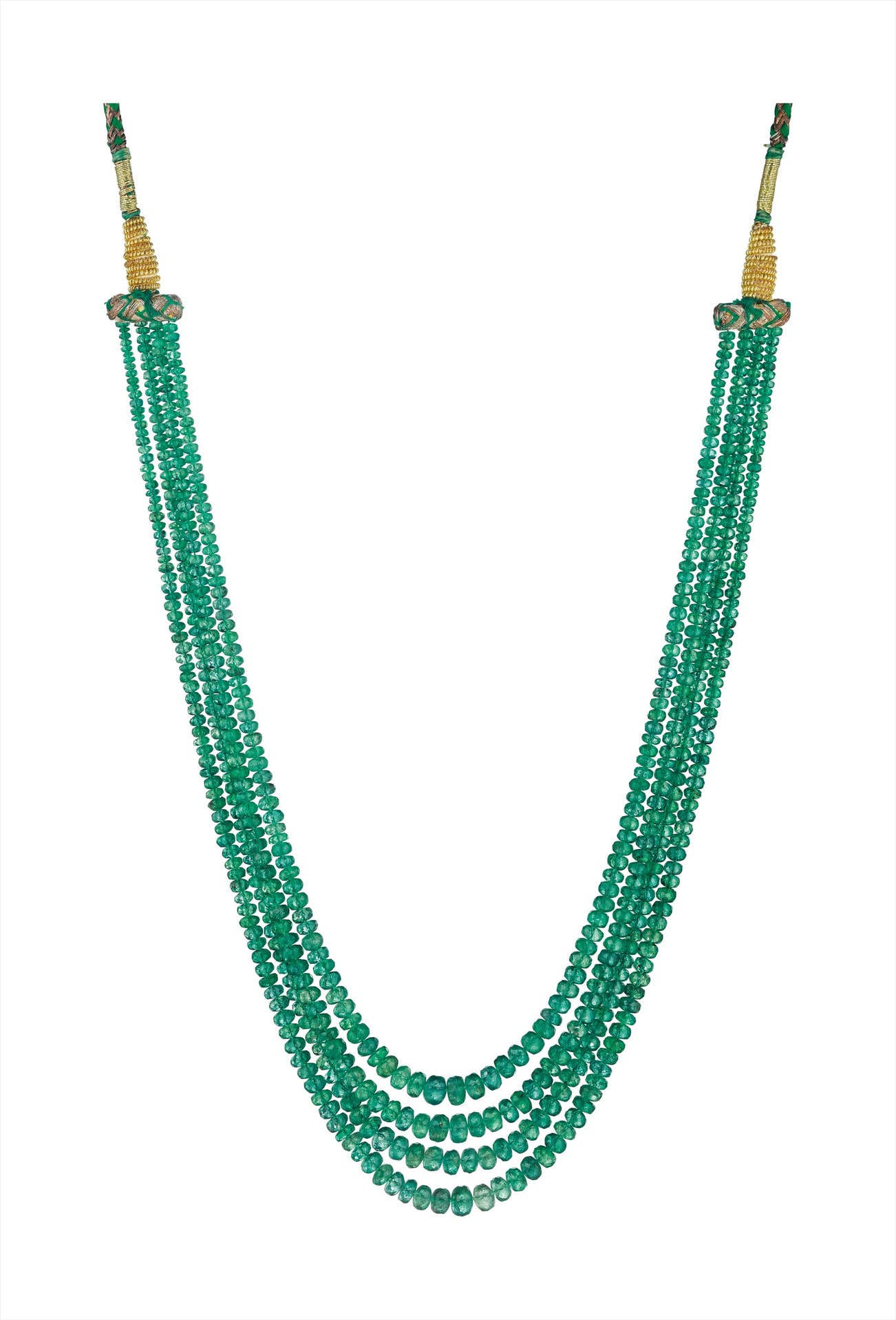 Designed as a four-strand graduated emerald bead necklace, joined by an adjustable woven thread back chain, length 32 to 35 inches.