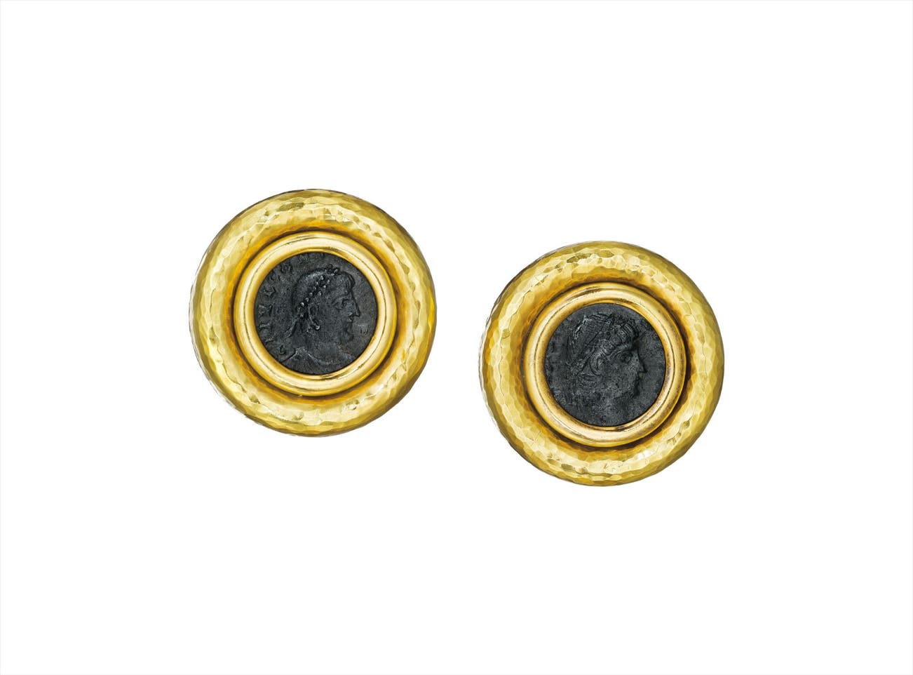 Each set with a coin, within a hammered gold frame, mounted in 18K yellow gold, length 1 inch.