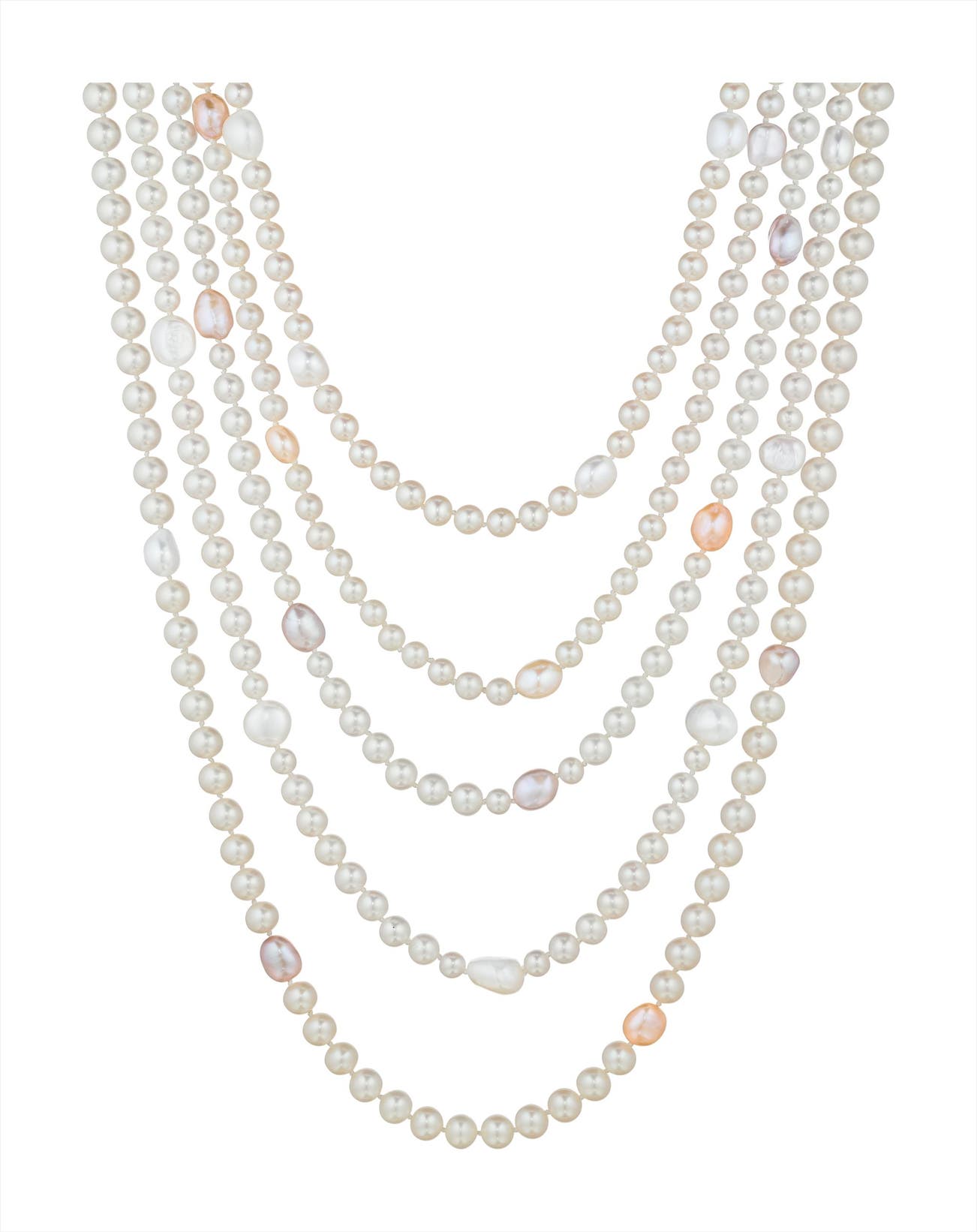 Designed as five strands of cultured pearls, interspersed by vari-colored baroque cultured pearls, joined by a circular-cut diamond bar clasp, mounted in 18K white gold, length 22 1/4 inches to 33 1/2 inches.