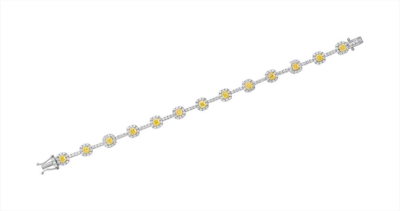 Designed as a line of cushion-cut yellow diamonds, enhanced by circular-cut diamond surrounds, interspersed by circular-cut diamond links, mounted in 18K white and yellow gold, length 7 inches.