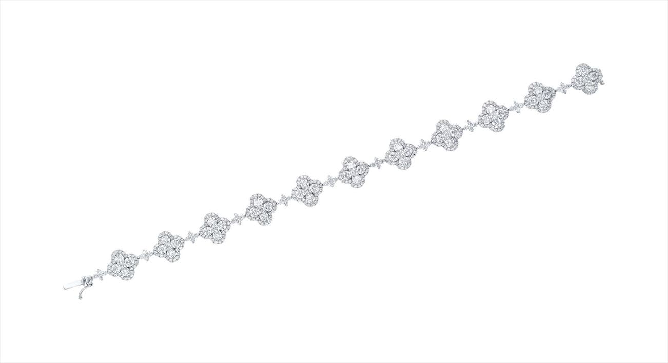 Designed as a line of alternating circular-cut diamond quatrefoil links, mounted in 18K white gold, length 7 inches.