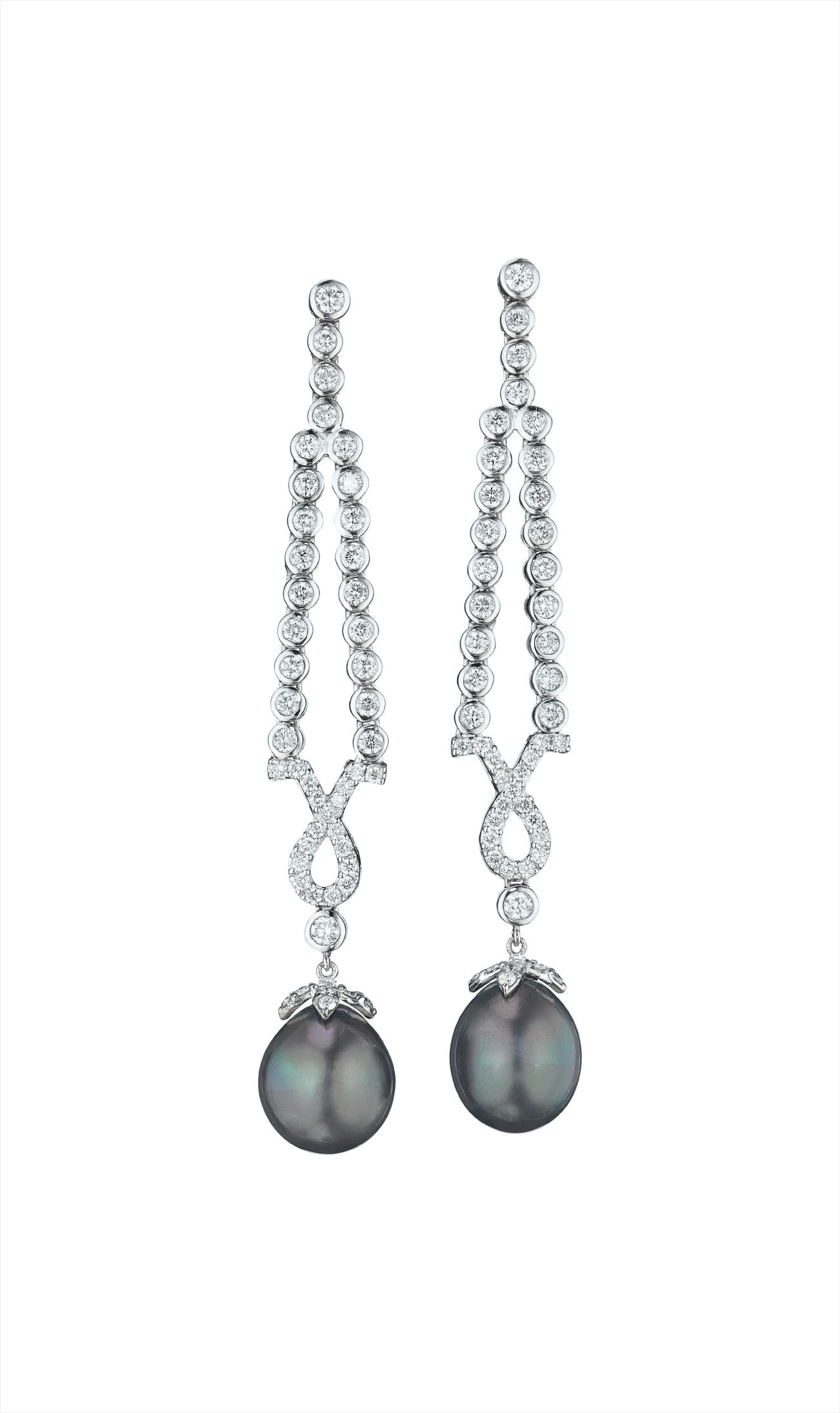 Each designed as a tapered flexible line of circular-cut and collet-set diamonds, suspending a cultured Tahitian pearl drop, mounted in 18K white gold, length 2 3/4 inches.