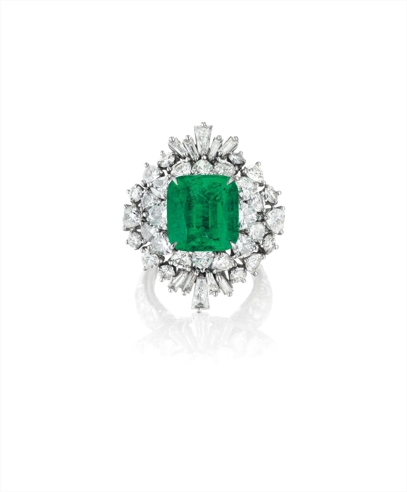 Centrally set with a cushion-cut emerald, weighing approxiamtely 6.90 carats, within a vari-cut diamond frame, to the bombé shoulders enhanced by circular-cut diamonds, mounted in platinum, size 6.