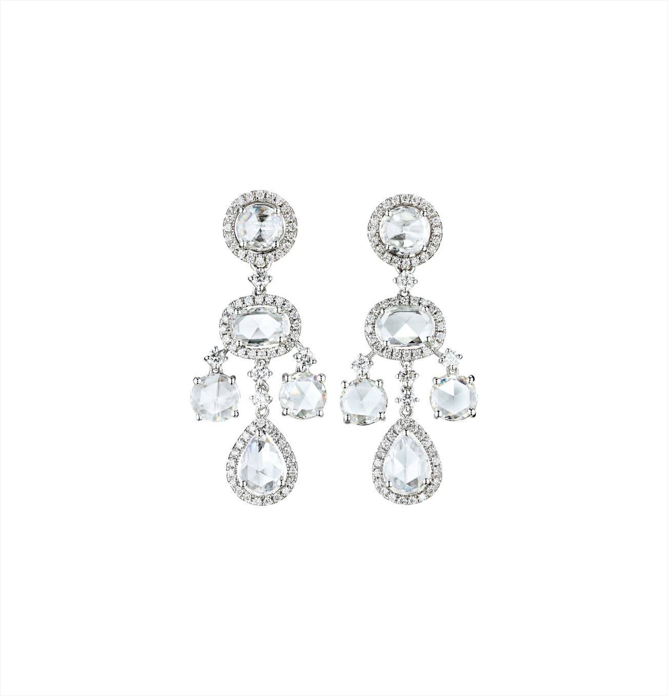 Each designed as a rose-cut diamond surmount within a pavé-set diamond surround, suspending a detachable drop of oval, circular, and pear-shape rose-cut diamonds, enhanced by circular-cut surrounds and spacer links, mounted in 18K white gold, length 1 1/4 inches.