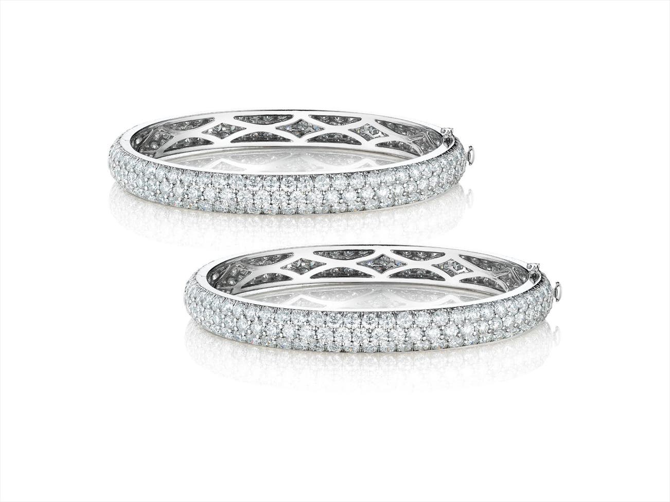 Each designed as a hinged bombé bangle, entirely set with pavé-set diamonds, mounted in 18K white gold, diameter 2 3/8 inches.