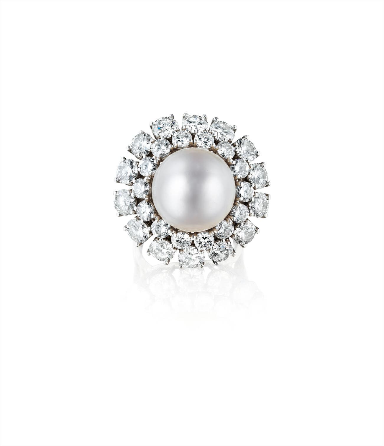 Centering upon a South Sea cultured pearl measuring approximately 14.50mm, enhanced by a circular-cut diamond surround, mounted in platinum, size 5 3/4.