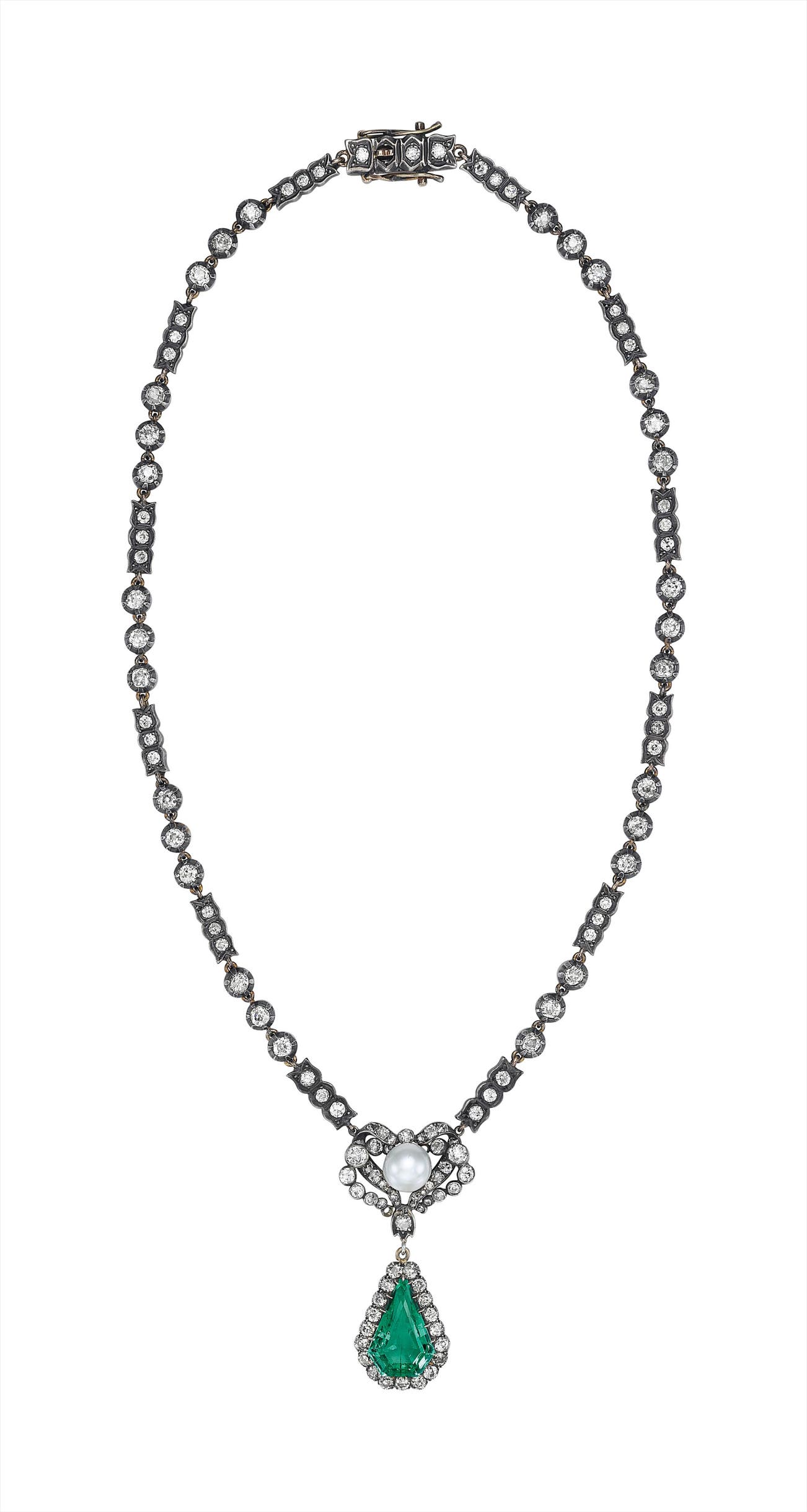 Suspending a kite-shaped emerald within an old-cut diamond surround, from a stylized ribbon motif plaque centering upon a cultured pearl, and the fancy link back chain set entirely with old-cut diamonds, mounted in silver-topped gold, chain length 16 1/2 inches, pendant length 1 3/4 inches.