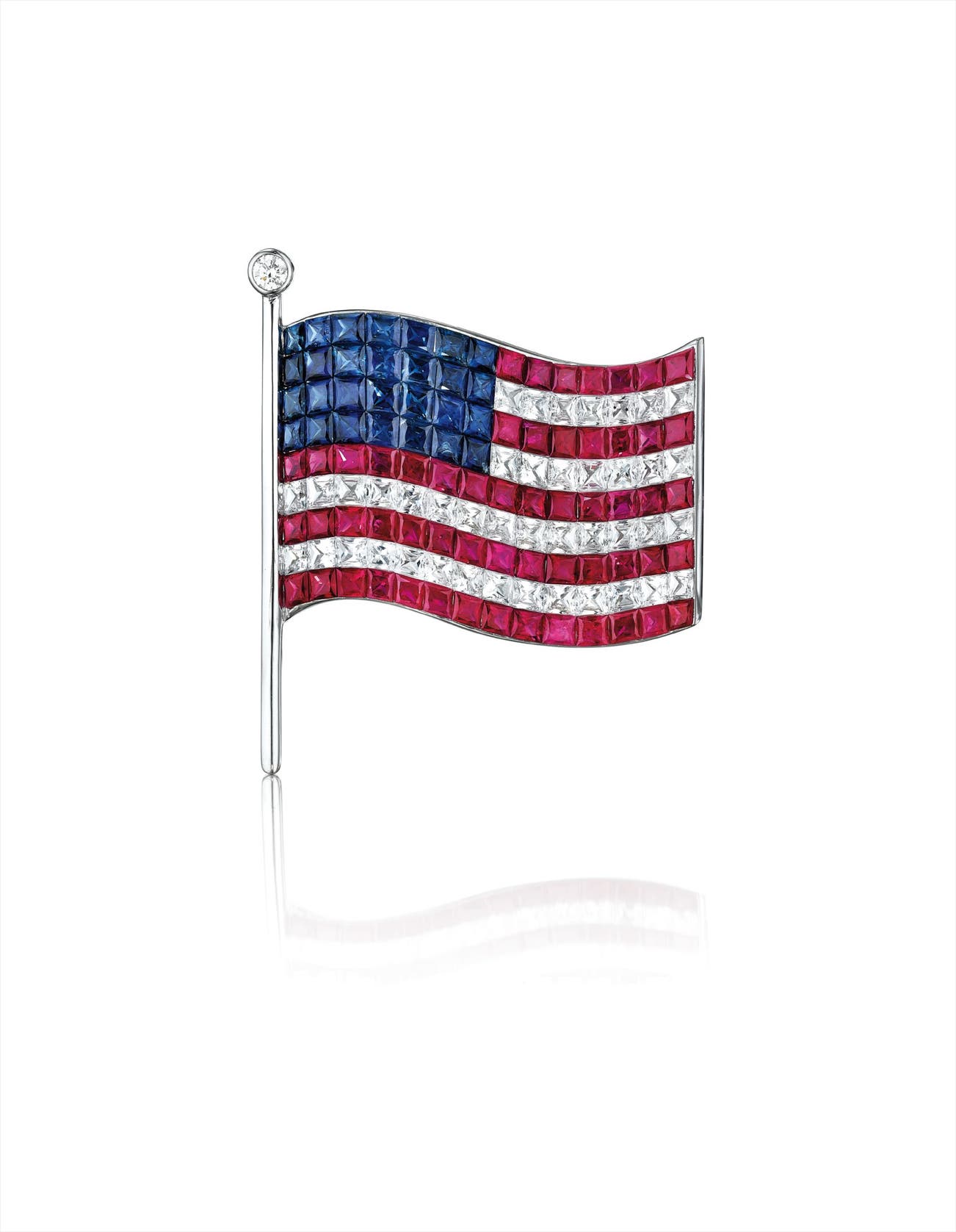 Designed as an American flag set entirely with calibré cut blue sapphires, white sapphires, and rubies, to the polished gold flag pole enhanced by a collet-set diamond, mounted in 18K white gold, length 1 5/8 inches.