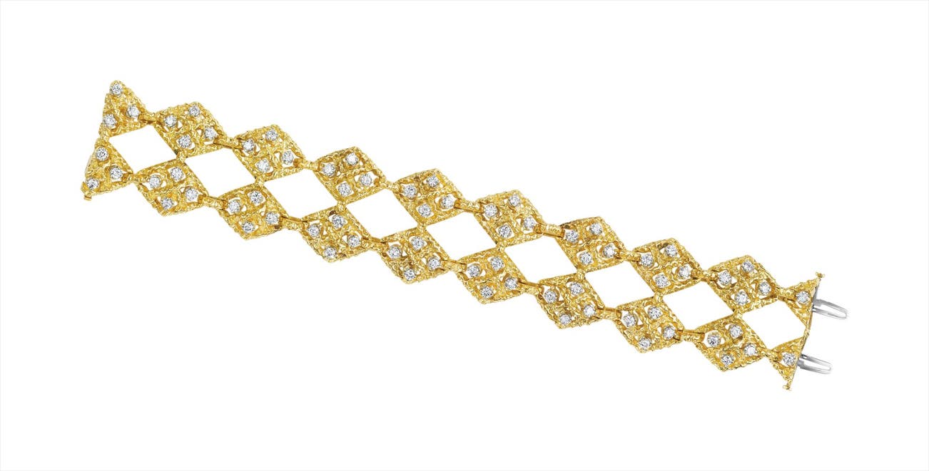 Designed as two rows of textured gold links enhanced by circular-cut diamonds, mounted in 18K yellow gold, length 7 1/4 inches.
