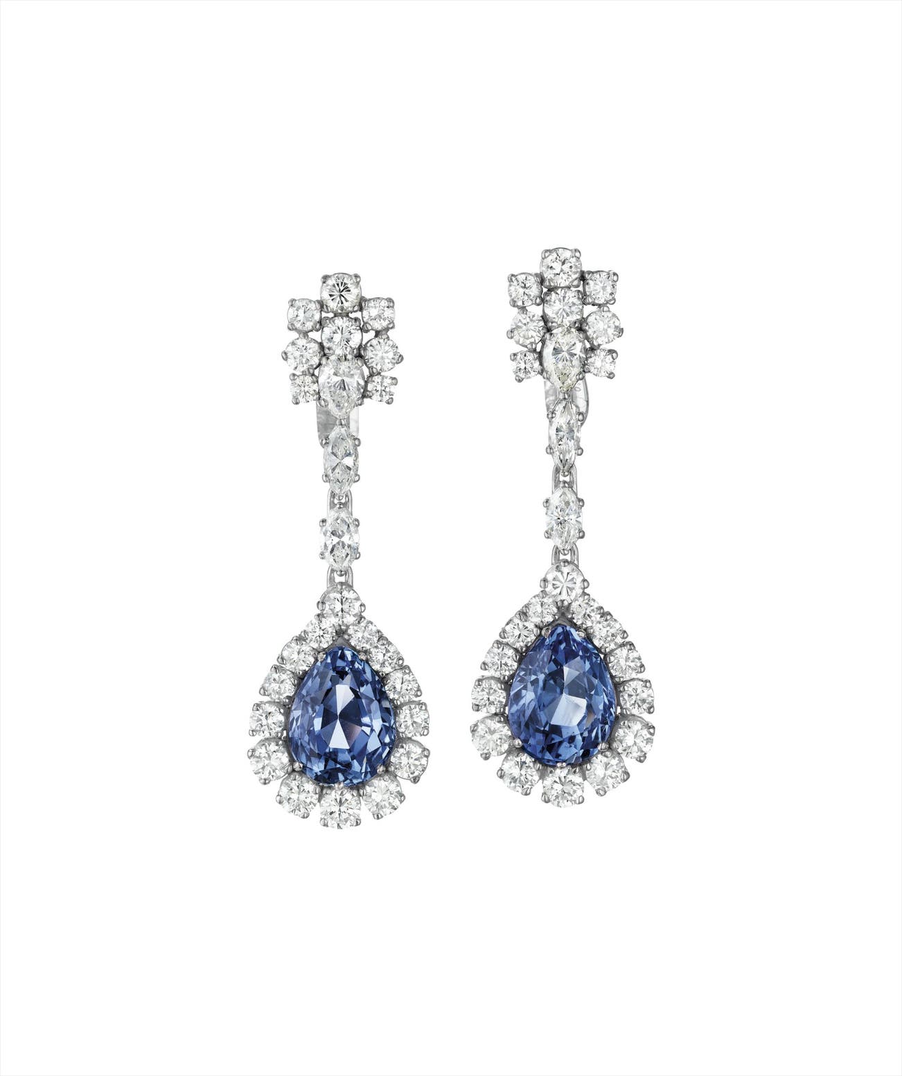 Each suspending a pear-shape unheated Ceylon sapphire, weighing approximately 5.79 and 5.73 carats, within a circular-cut diamond surround, to the marquise-cut diamond spacer links and vari-cut diamond cluster surmount, mounted in 14K white gold, length 1 7/8 inches.
