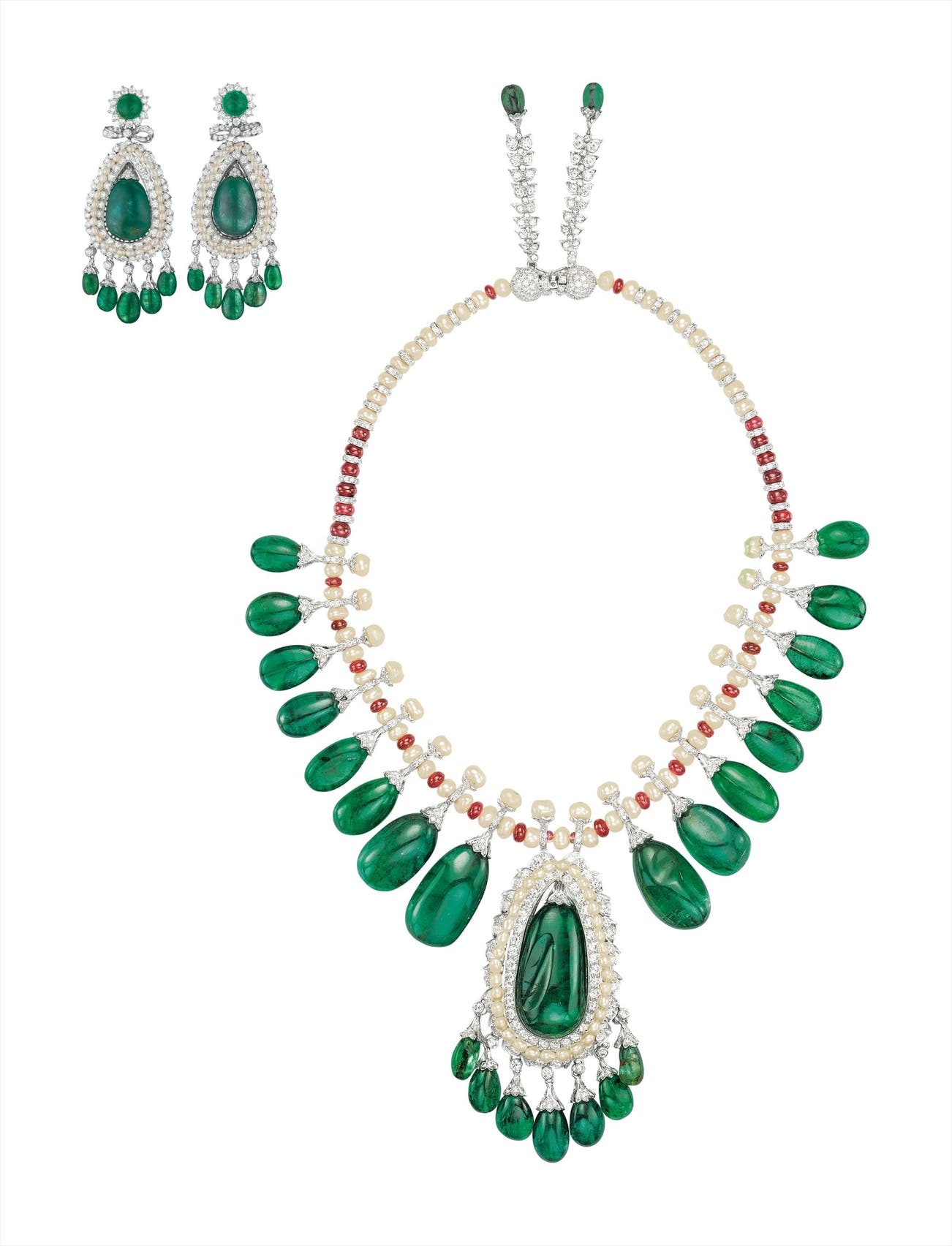 Comprising a necklace designed as a line of cultured pearl and ruby beads, suspending a series of graduated emerald drops enhanced by pavé-set diamond caps, the center drop set within a circular-cut diamond and cultured pearl surround, enhanced by circular-cut diamond and emerald drop fringes; a pair of ear pendants en suite, mounted in white gold.