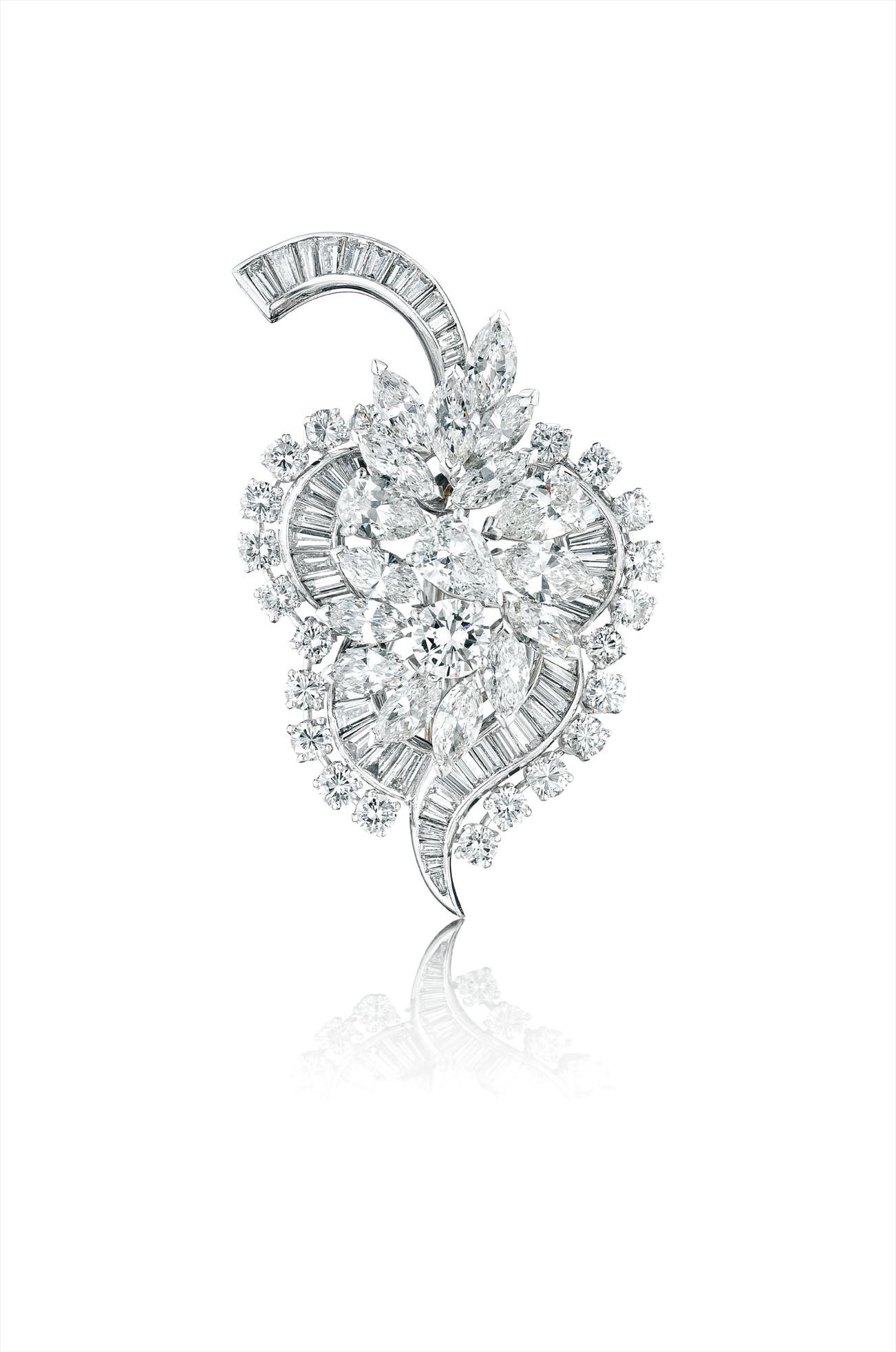 Centrally set with a cluster of vari-cut diamonds, to the baguette-cut diamond surround and spray, and circular-cut diamond border, mounted in platinum, length 2 1/4.