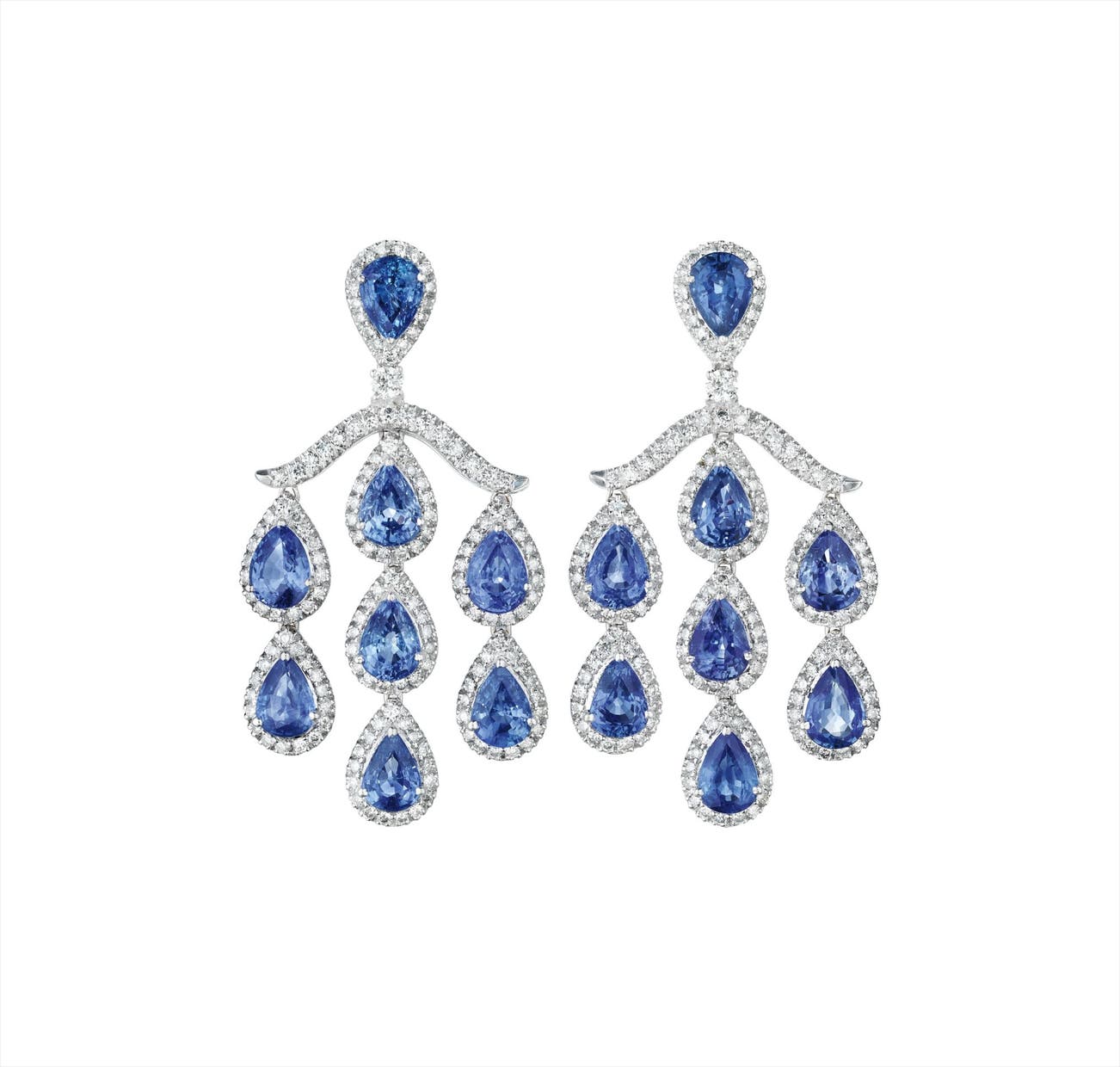 Each designed as a series of cascading pear-shape sapphires within pavé-set diamond surrounds, suspended from a contoured line set with pavé-diamonds, to the similarly designed surmount, mounted in 18K white gold, length 2 inches.