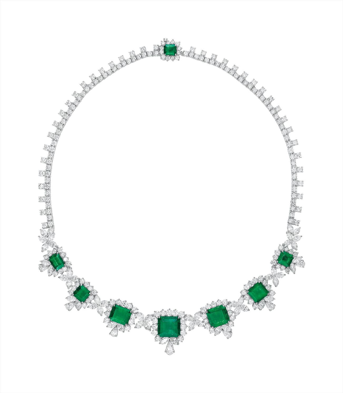 Centering upon a series of rectangular-cut emeralds, weighing approximately 19.25 carats in total, within vari-cut diamond surrounds, interspersed by marquise-cut diamond florets, to the circular-cut diamond back chain and clasp enhanced by a rectangular-cut emerald, mounted in 18K white gold, length 16 1/2 inches.