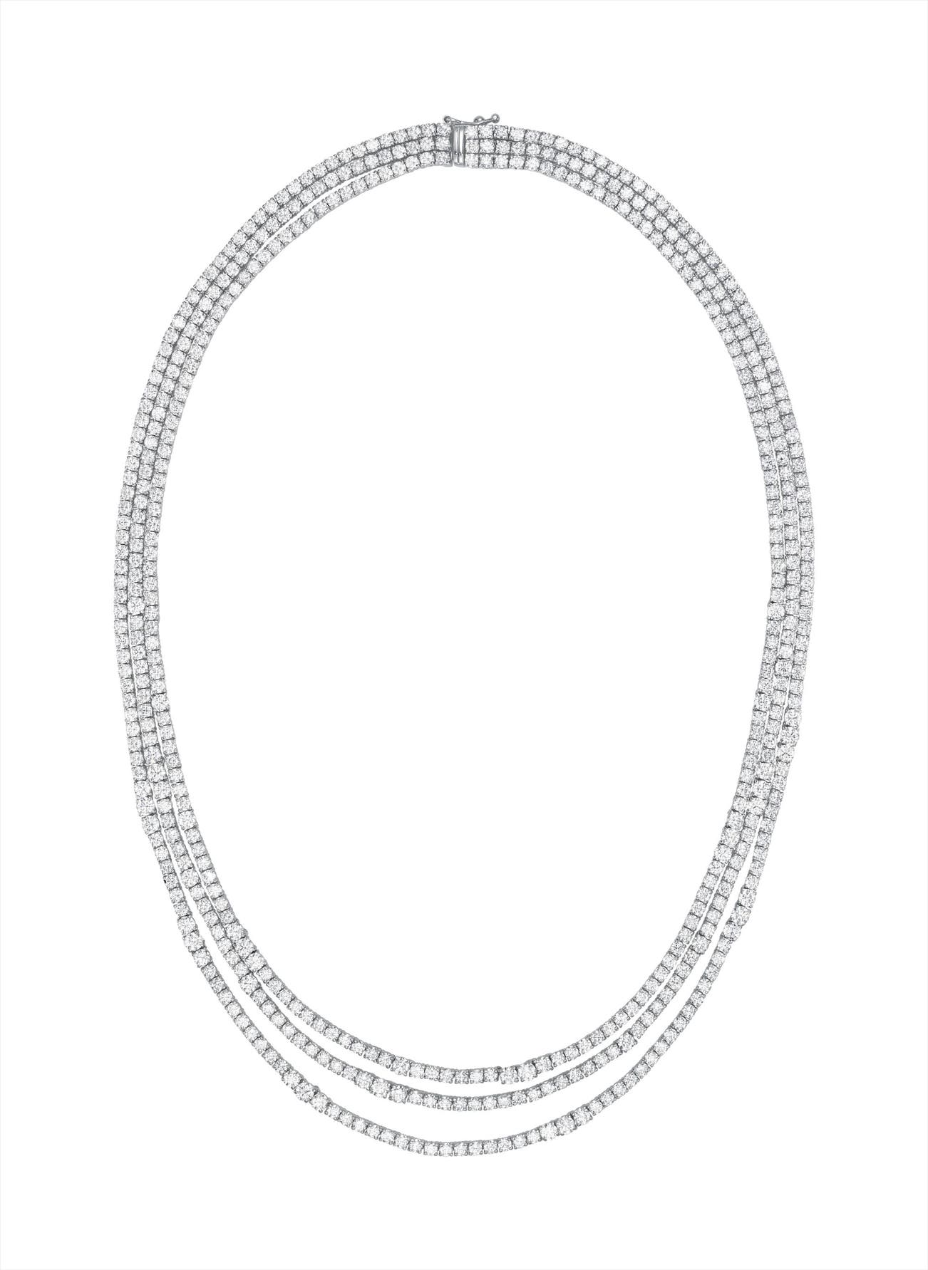 Designed as three lines of graduated circular-cut diamonds, mounted in 18K white gold, length 16 3/4 inches to 17 1/2 inches.
