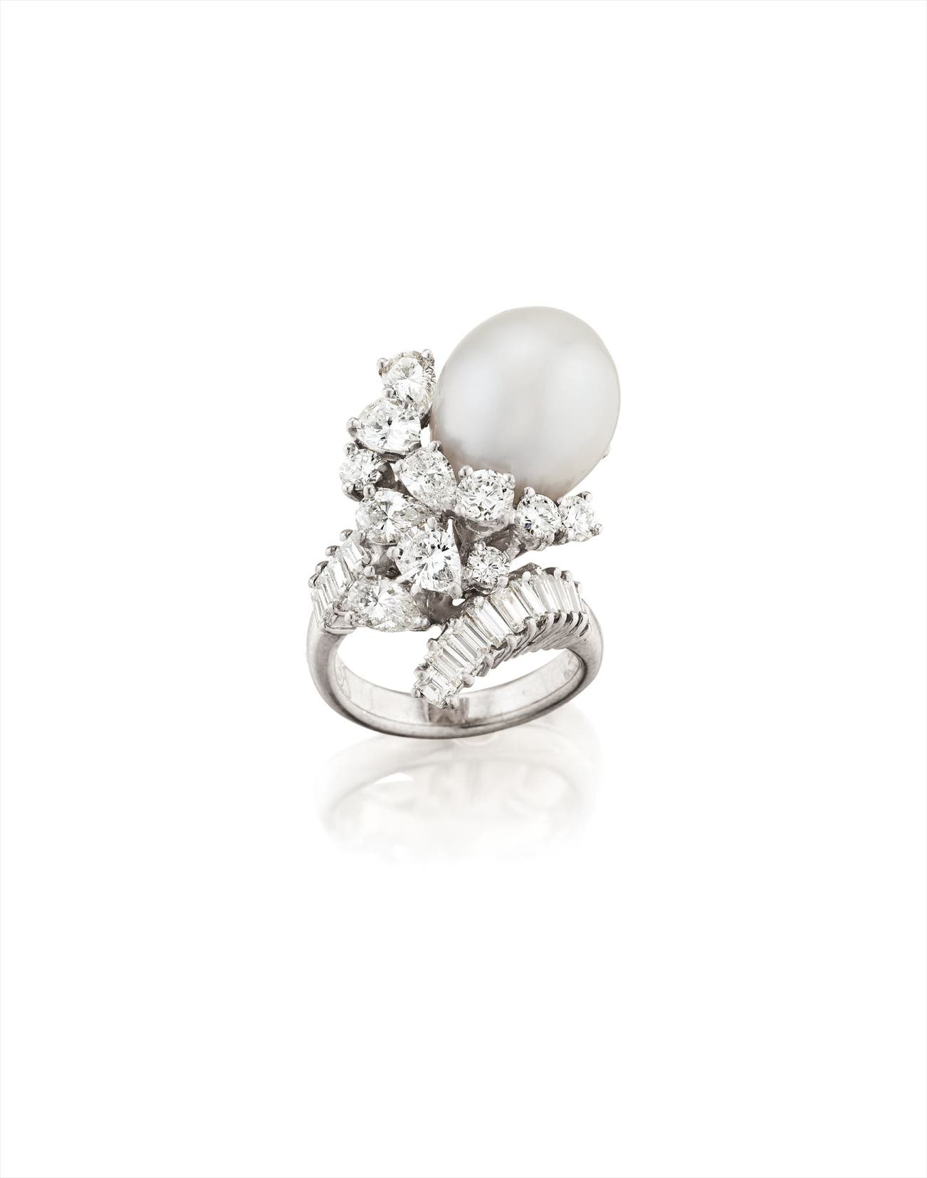 Of asymmetric design, set with a South Sea cultured pearl measuring approximately 14.10 by 12.30 mm, to the vari-cut diamond cluster surround and baguette-cut diamond terminal, mounted in 18K white gold and platinum, size 6.