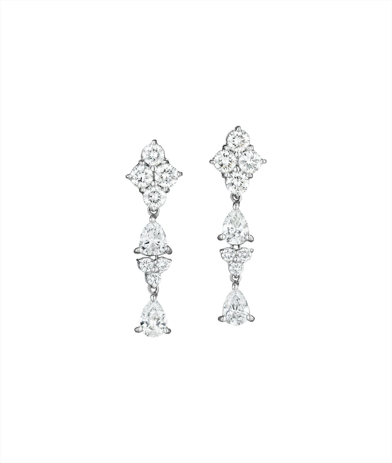 Each designed as an articulated line of pear and circular-cut diamonds suspended from a circular-cut diamond quatrefoil surmount, mounted in 18K white gold, length 1 3/8 inches.