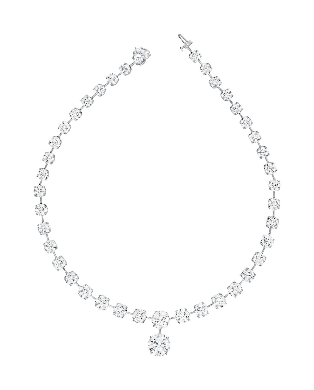Designed as a graduated series of forty-one circular-cut diamonds weighing approximately 68.47 carats in total, suspending a circular-cut diamond weighing 8.59 carats, mounted in platinum, length 17 1/4 inches.