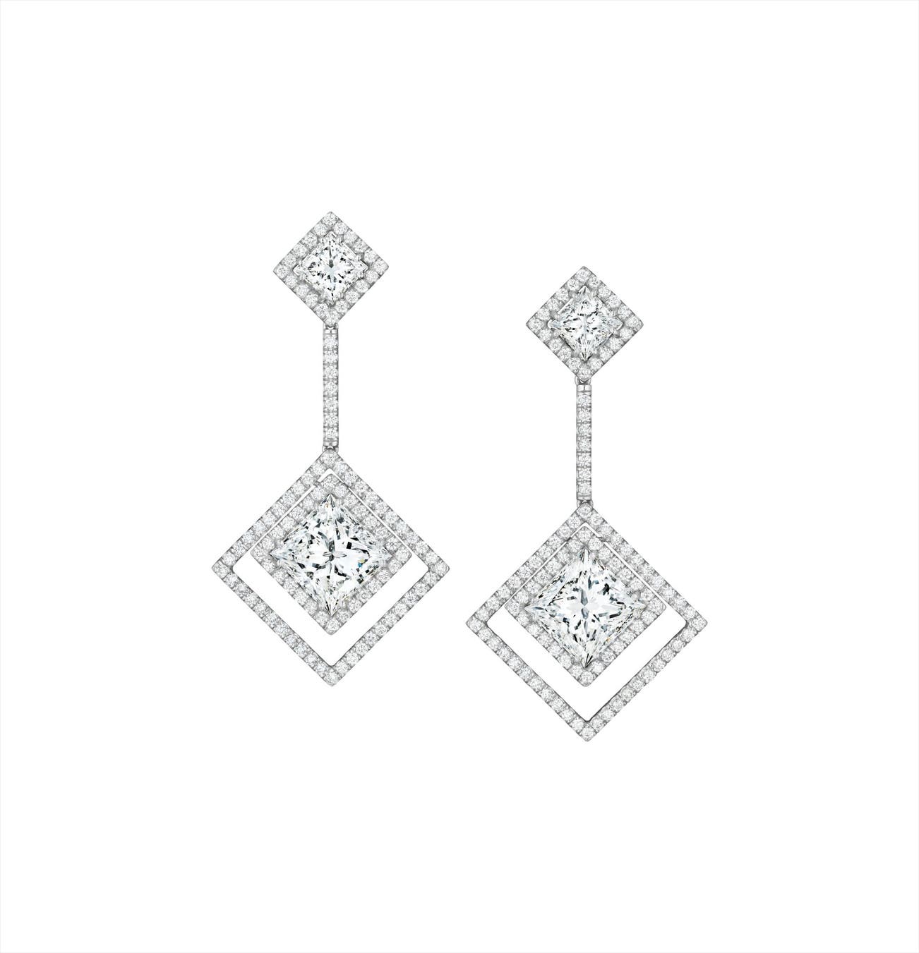 Of articulated design, each suspending a pavé-set diamond kite-shape plaque centering upon a square-cut diamond weighing approximately 6.03 carats in total, from a pavé-set diamond line and similarly designed surmount, mounted in platinum, length 1 3/4 inches.