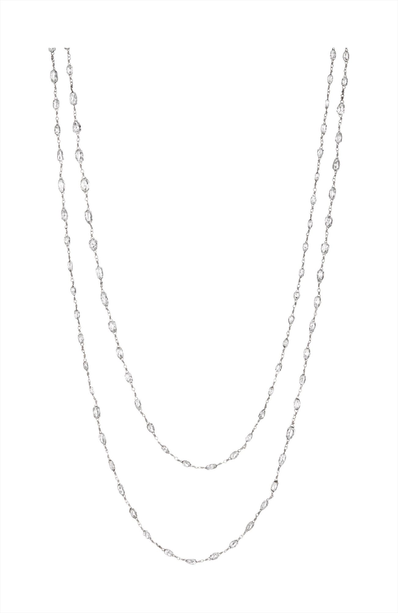 Designed as a briolette-cut diamond longchain, weighing approximately 43.59 carats in total, interspersed by a fine link chain, mounted in platinum, length 48 inches.