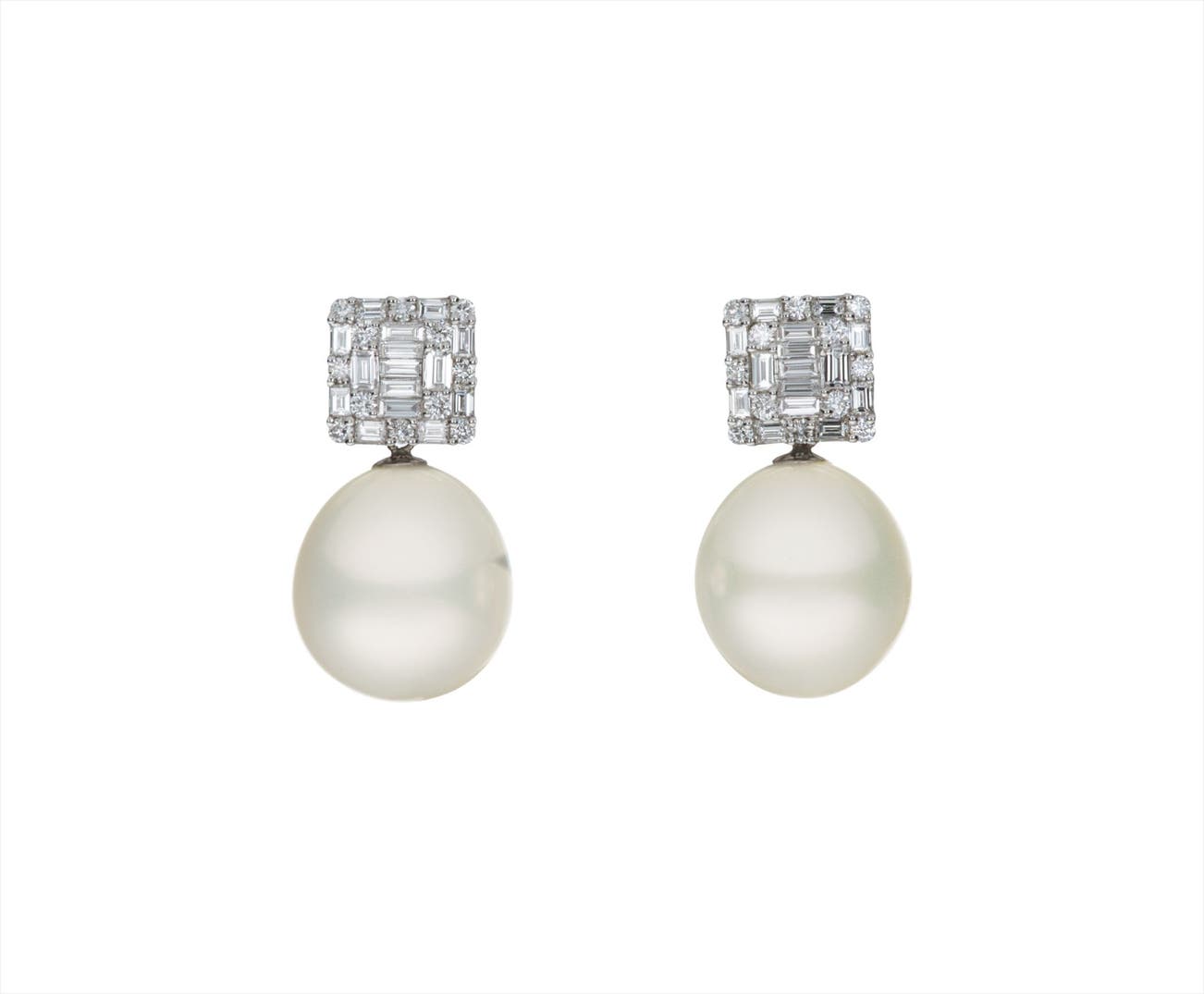 Each designed as a square plaque set with baguette and circular-cut diamonds, suspending a detachable South Sea cultured pearl drop measuring approximately 17.00 mm, mounted in 18K white gold, length 1.25 inches.
