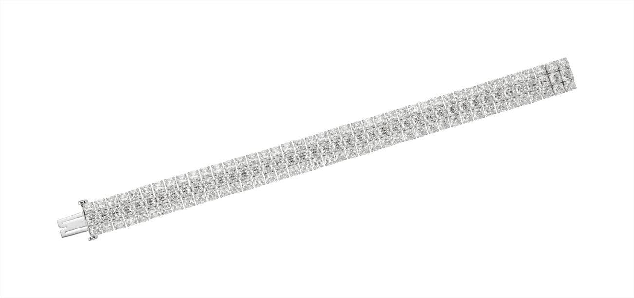 Designed as three lines of cushion-cut diamonds weighing approximately 38.95 carats in total, extending to the concealed clasp, mounted in 18K white gold, length 7 inches.