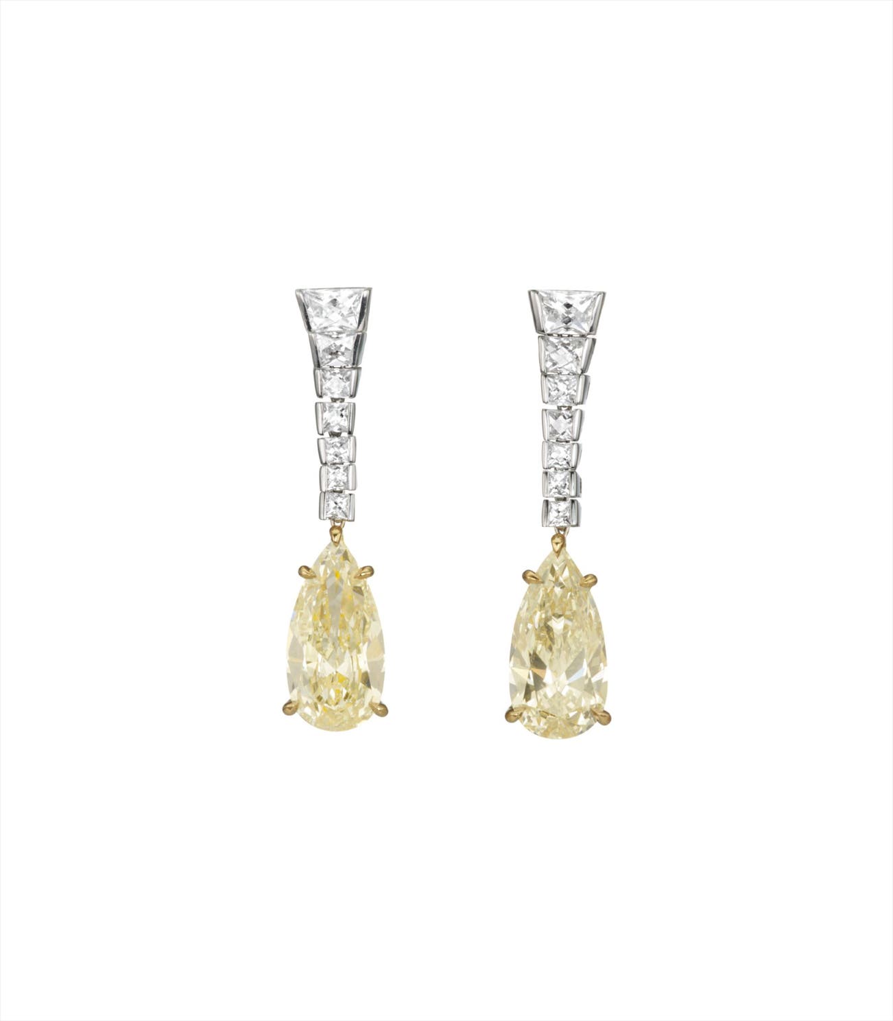 Each suspending a pear-shape yellow diamond, weighing approximately 2.54 and 2.28 carats, from a line of graduated trapezoid and square-cut diamonds, mounted in 18K white and yellow gold, length 1 1/4 inches.