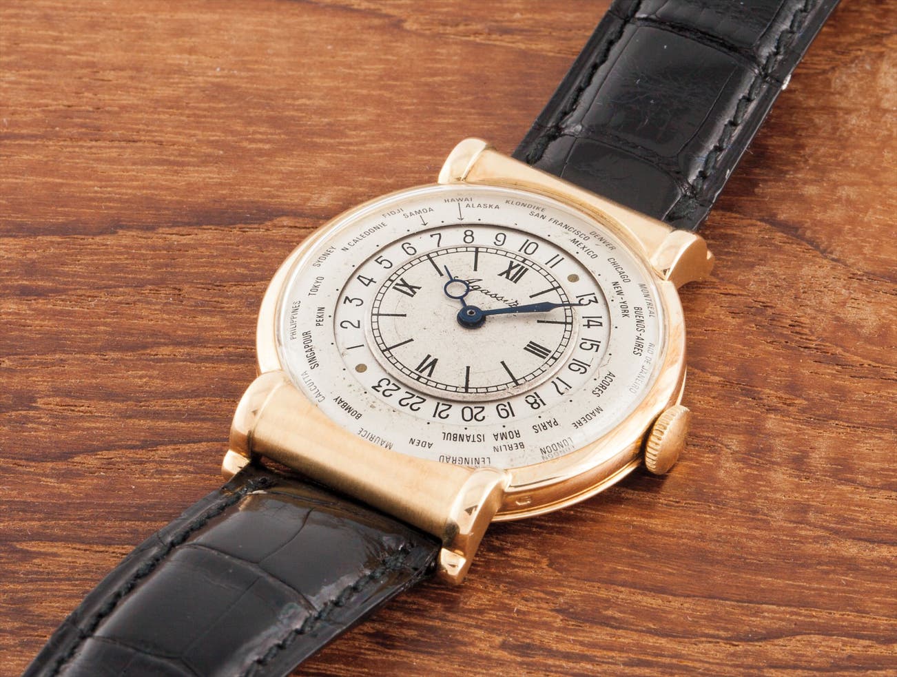 A fine and very rare yellow gold wristwatch with hooded lugs and world time indication