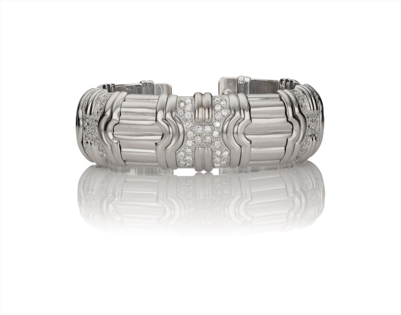 The polished gold spring band, of geometric interlocking design, enhanced by pavé-set diamonds, mounted in 18K white gold, diameter 2 1/4 inches.