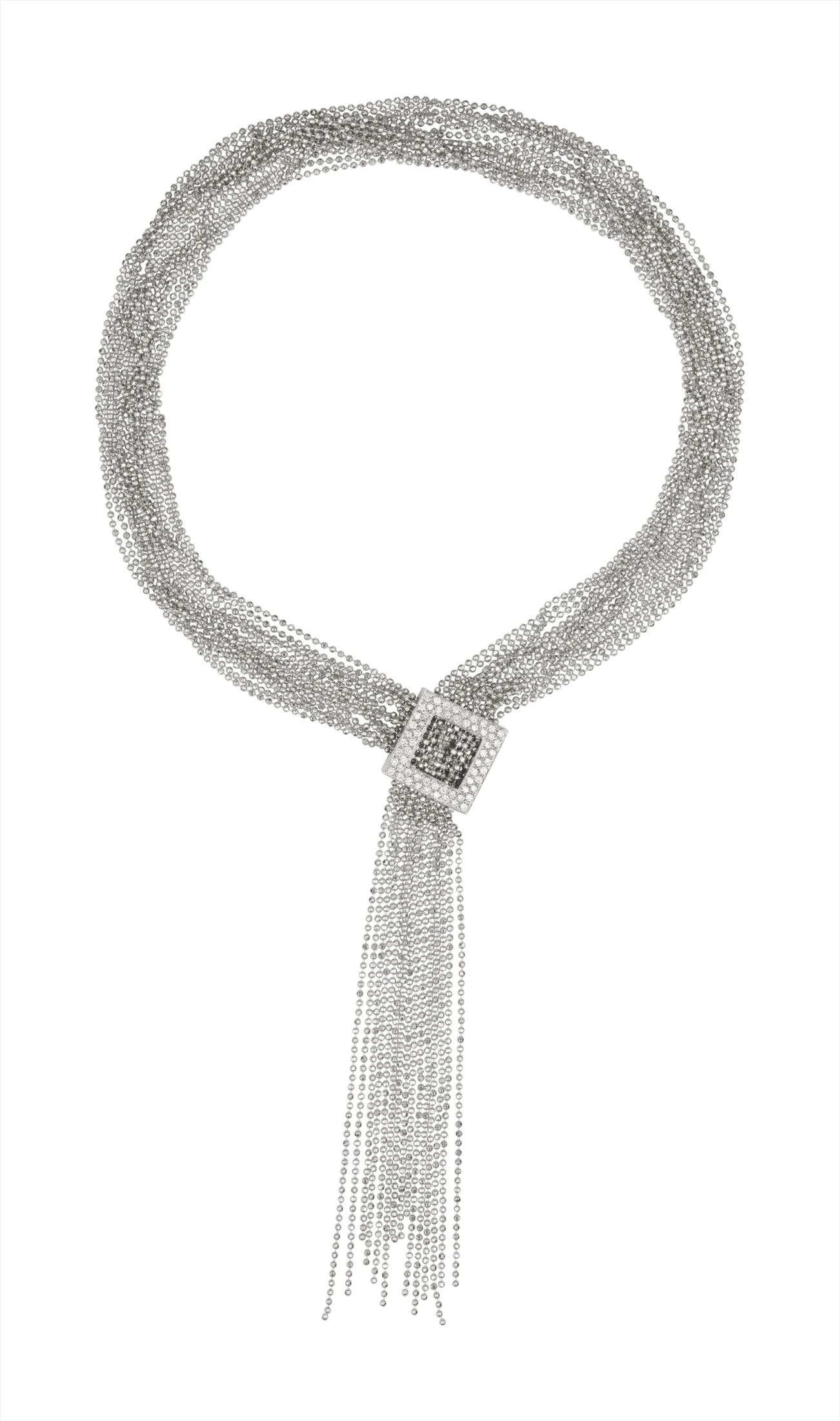 Designed as a cascade of polished gold bead fringes gathered by a square pavé-set diamond clasp, mounted in 18K white gold, length 22 inches.