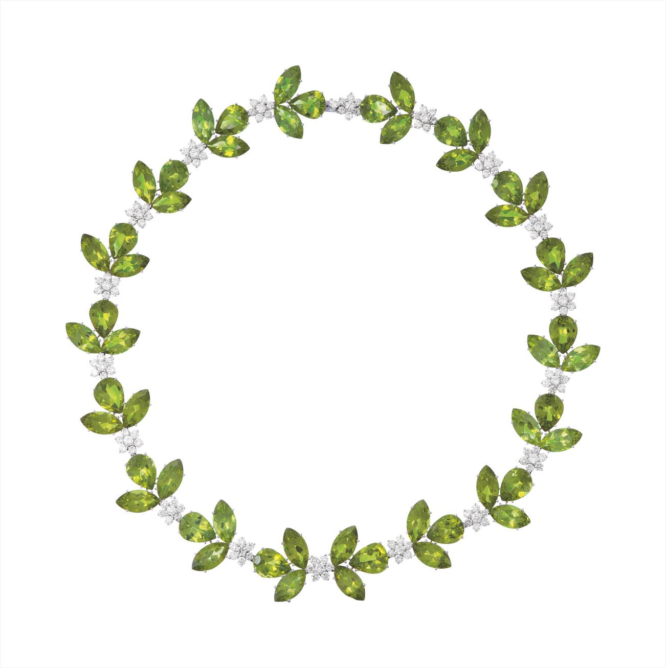 Of foliate design, the marquise and pear-shape peridot clusters interspersed by circular-cut diamond flowerhead spacer links, mounted in 18K white gold, length 18 inches.
