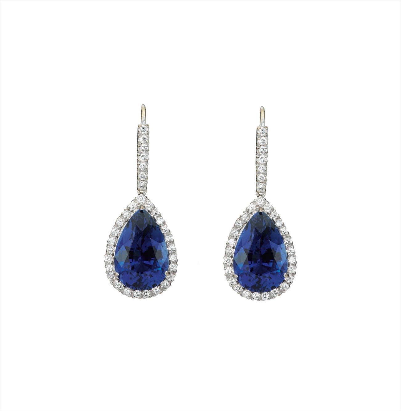 Each suspending a pear-shape sapphire weighing approximately 20.83 carats in total, to the circular-cut diamond surround and surmount, mounted in 18K white gold, length 1 1/2 inches.