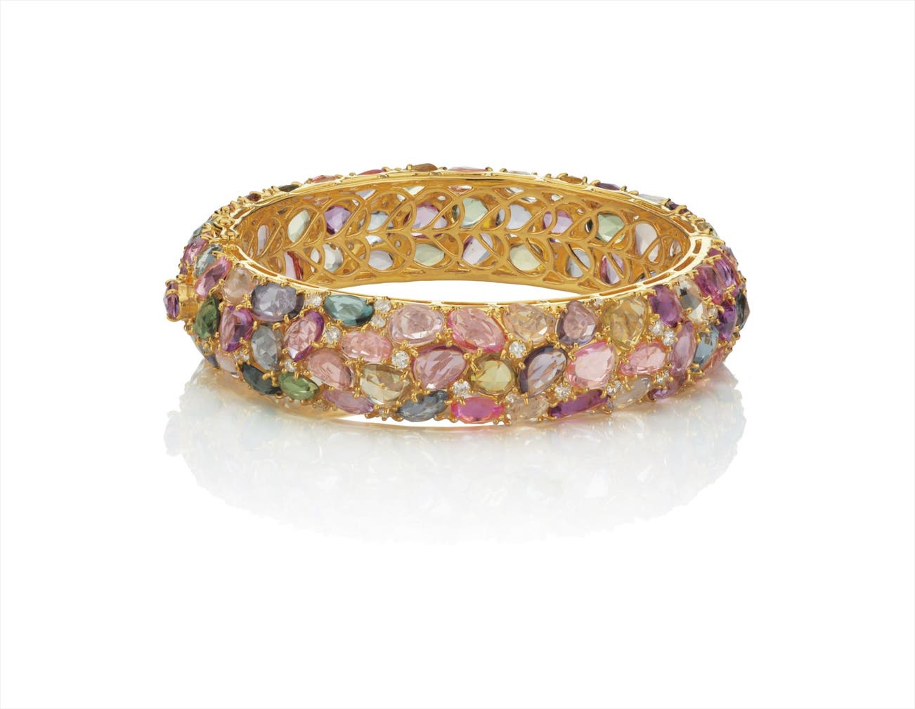 Designed as a hinged bangle set entirely with vari-cut multi-colored sapphires, weighing approximately 52.17 carats in total, enhanced by circular-cut diamonds, mounted in 18K yellow gold, diameter 2 1/4 inches.