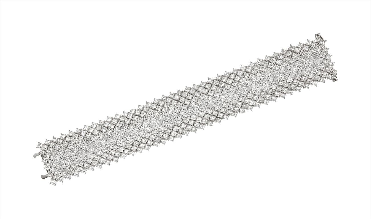 Designed as a highly flexible wide band, set entirely with square-cut diamonds weighing approximately 67.94 carats in total, mounted in 18K white gold, length 7 inches.