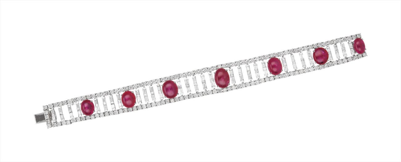 Centering upon a line of cabochon rubies, weighing approximately 33.95 carats in total, with baguette-cut diamond spacers, to the circular-cut diamond border, mounted in 18K white gold, length 7 1/2 inches.