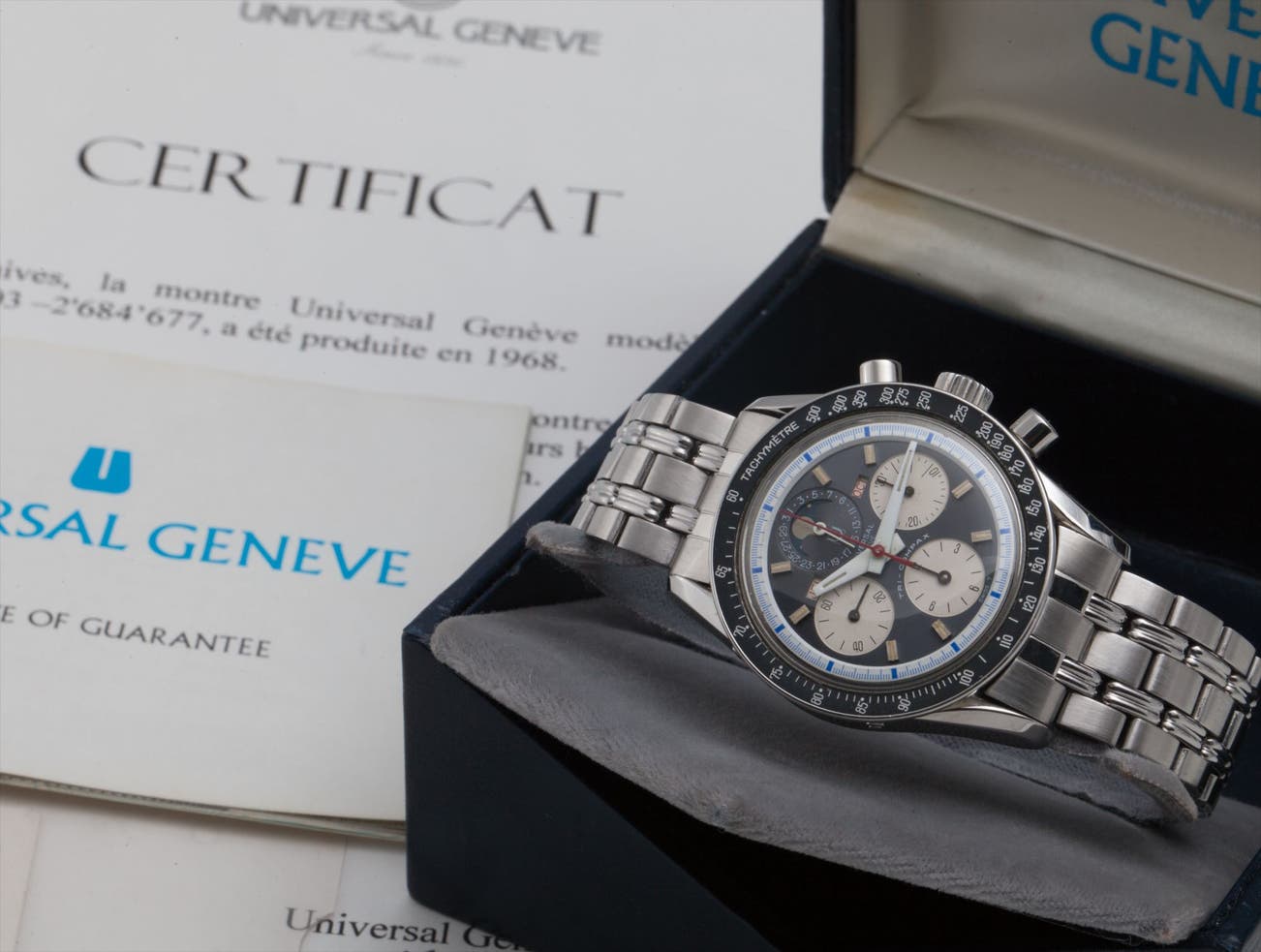 The present steel Tri-Compax is one of the best looking and best preserved examples the market has seen in many years. Made in 1968 and still accompanied by its original Gay Frères steel bracelet stamped 2/68, it also comes with its original box and blank guarantee. No one could be blamed for mistaking this Tri-Compax from a few feet away with a Rolex Daytona reference 6241 Paul Newman. However, this Universal features a complete calendar and phases of the moon, a complication that the celebrated Cosmograph never offered. The main dial plate, finished in blue metallic, is an incredible work of art and is framed by a raised ring featuring a blue scale calibrated for the 5th of a second.Preserved in overall original condition, this Tri-Compax offers excellent value and is much rarer than any of its more famous contemporaries from Geneva.