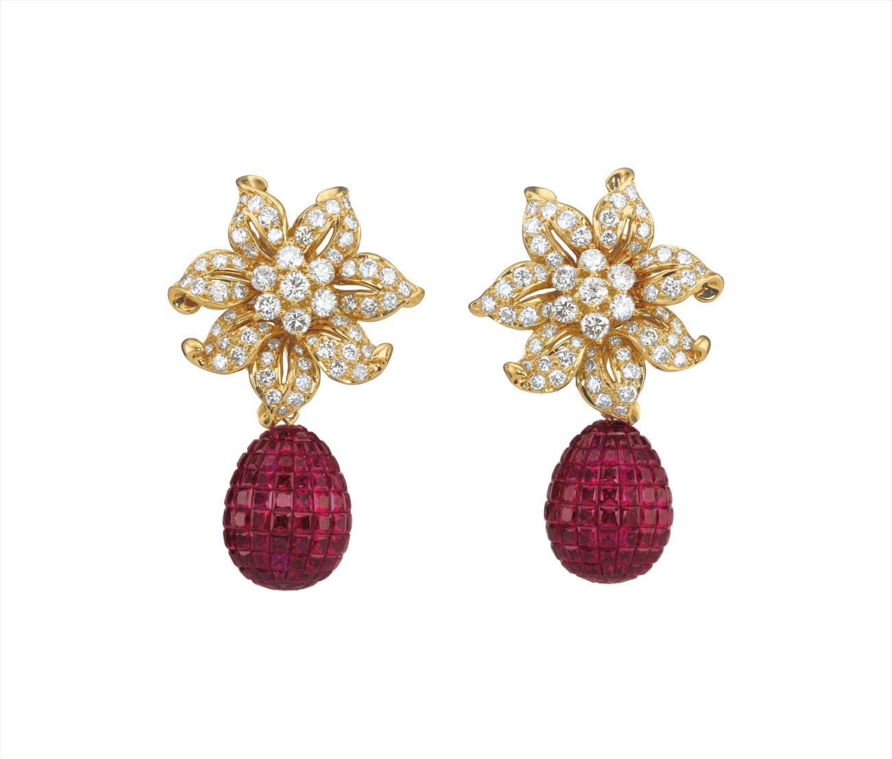 Each suspending a detachable calibré-cut ruby drop from a polished gold flowerhead surmount, set with circular-cut diamonds, mounted in 18K yellow gold, length 2 inches.