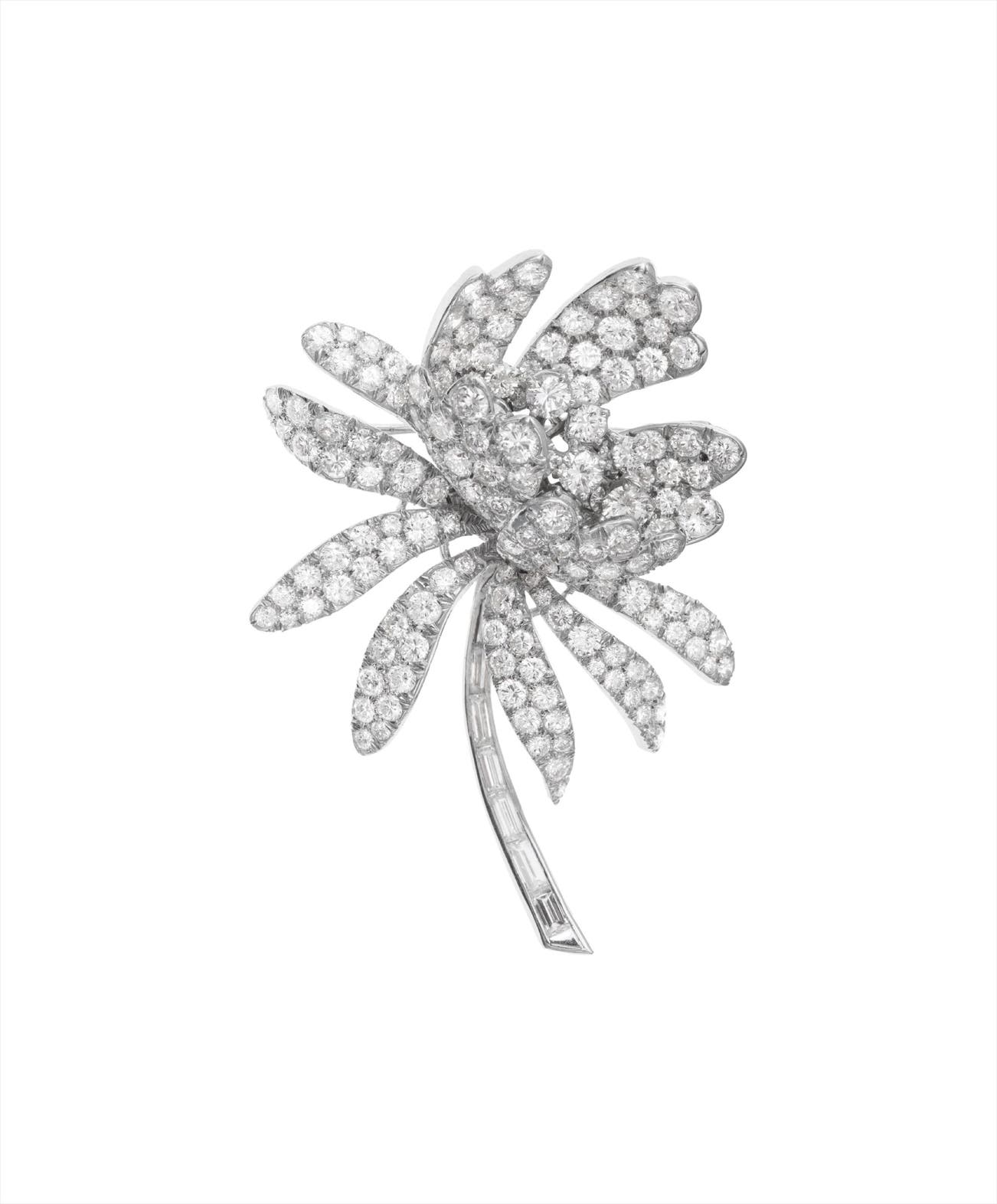 Designed as a flower set with circular-cut diamonds, the stem set with baguette-cut diamonds, mounted in platinum, length 2 1/4 inches.