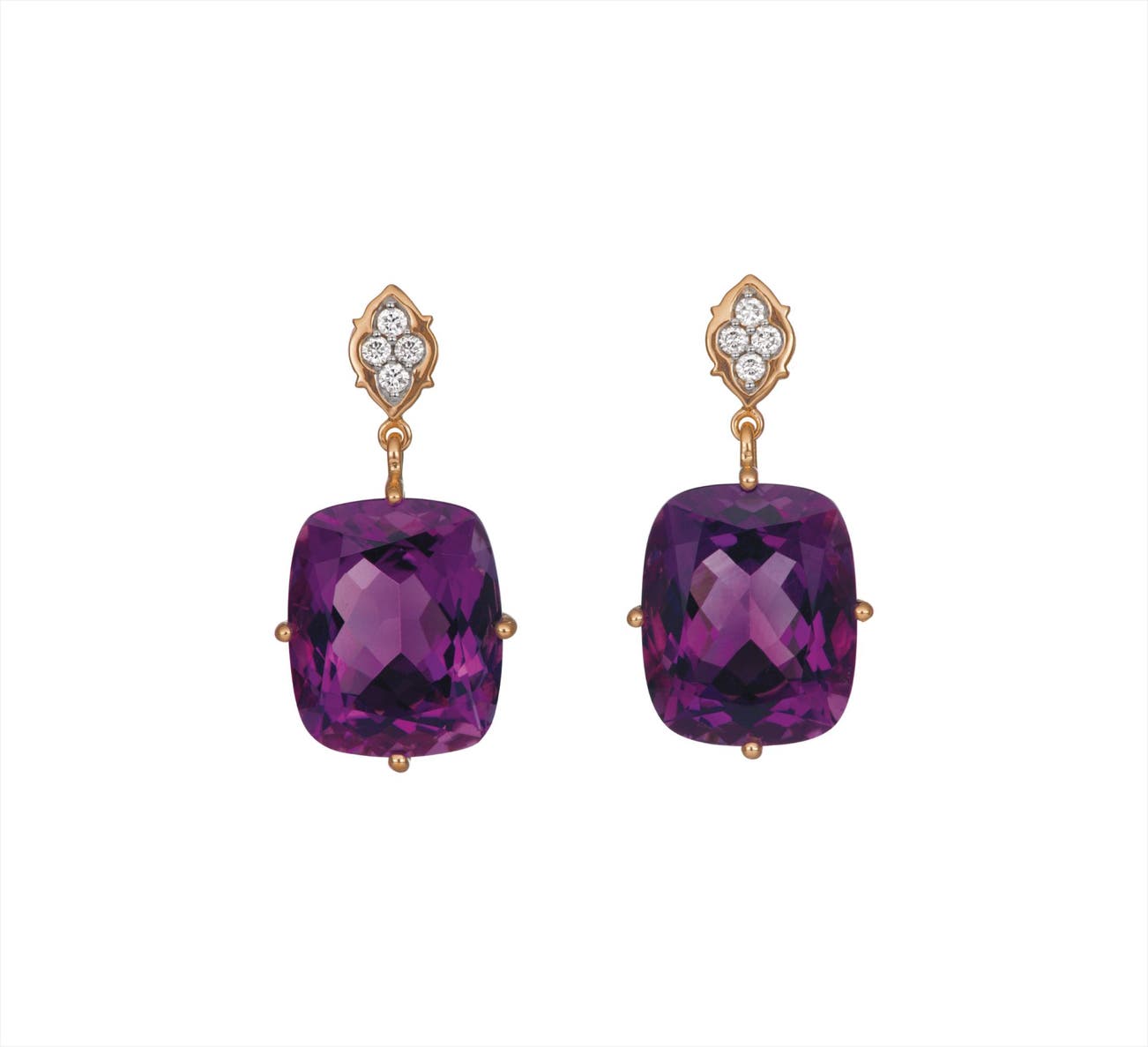 Each suspending a detachable cushion-cut amethyst weighing approximately 36.70 carats in total, from a navette-shape surmount enhanced by circular-cut diamonds, mounted in 18K rose gold, length 1 3/8 inches.
