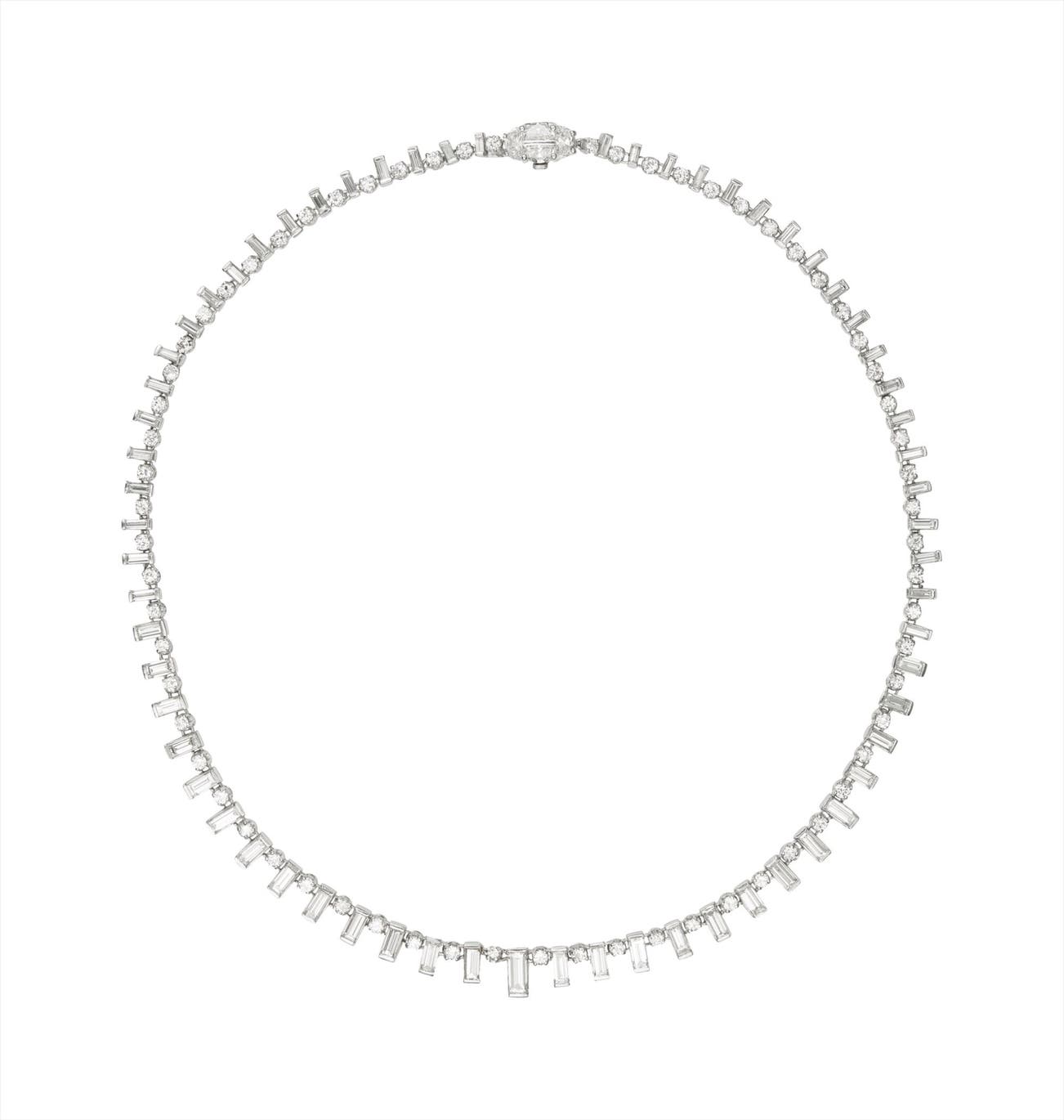 Designed as graduated line of alternating baguette and circular-cut diamonds, extending to the clasp set with half-moon cut diamonds, mounted in 18K white gold, length 16 1/2 inches.